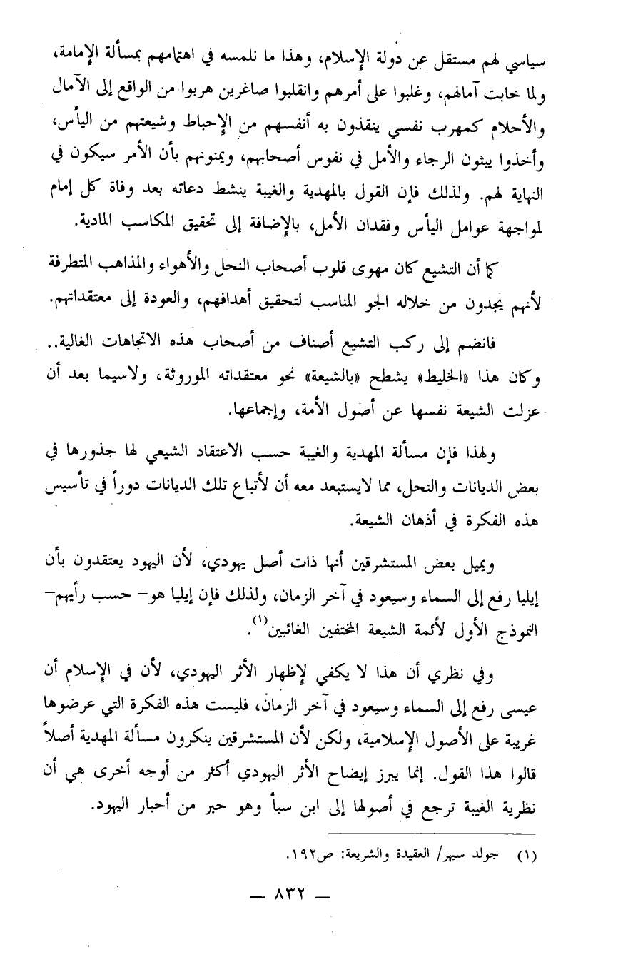 وفي نظري أن هذا لا يكفي لإظهار الأثر اليهودي، لأن في الإسلام أن عيسى رفع إلى السماء وسيعود في آخر الزمان، فليست هذه الفكرة التي عرضوها غريبة على الأصول الإسلامية، ولكن لأن المستشرقين ينكرون مسألة المهدية أصلاً قالوا هذا القول. إنما يبرز إيضاح الأثر اليهودي أكثر من أوجه أخرى هي أن نظرية الغيبة ترجع في أصولها إلى ابن سبأ وهو حبر من أحبار اليهود.