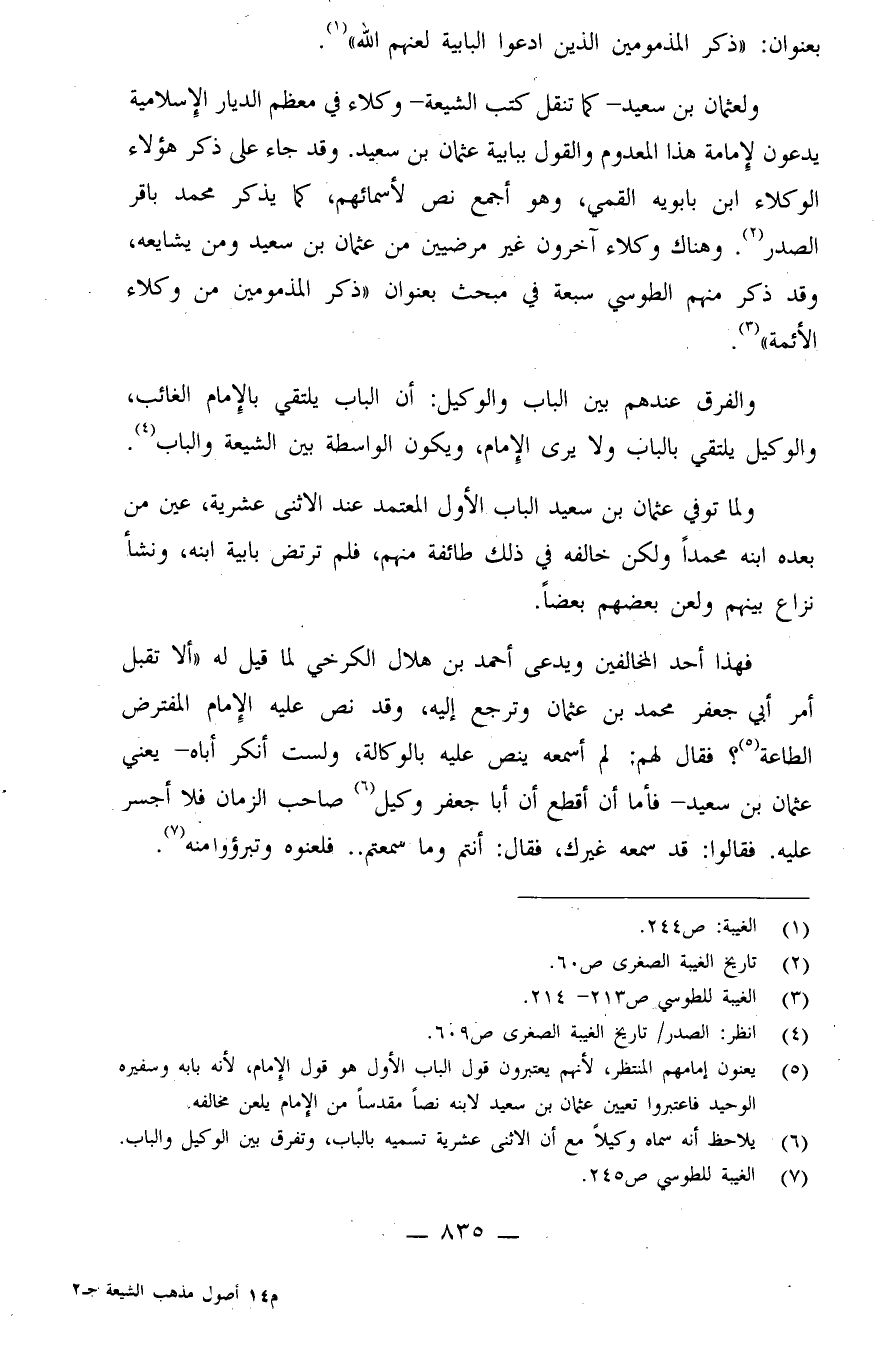 (¬5) يعنون إمامهم المنتظر، لأنهم يعتبرون قول الباب الأول هو قول الإمام، لأنه بابه وسفيره الوحيد، فاعتبروا تعيين عثمان بن سعيد لابنه نصًا مقدسًا من الإمام يلعن مخالفه