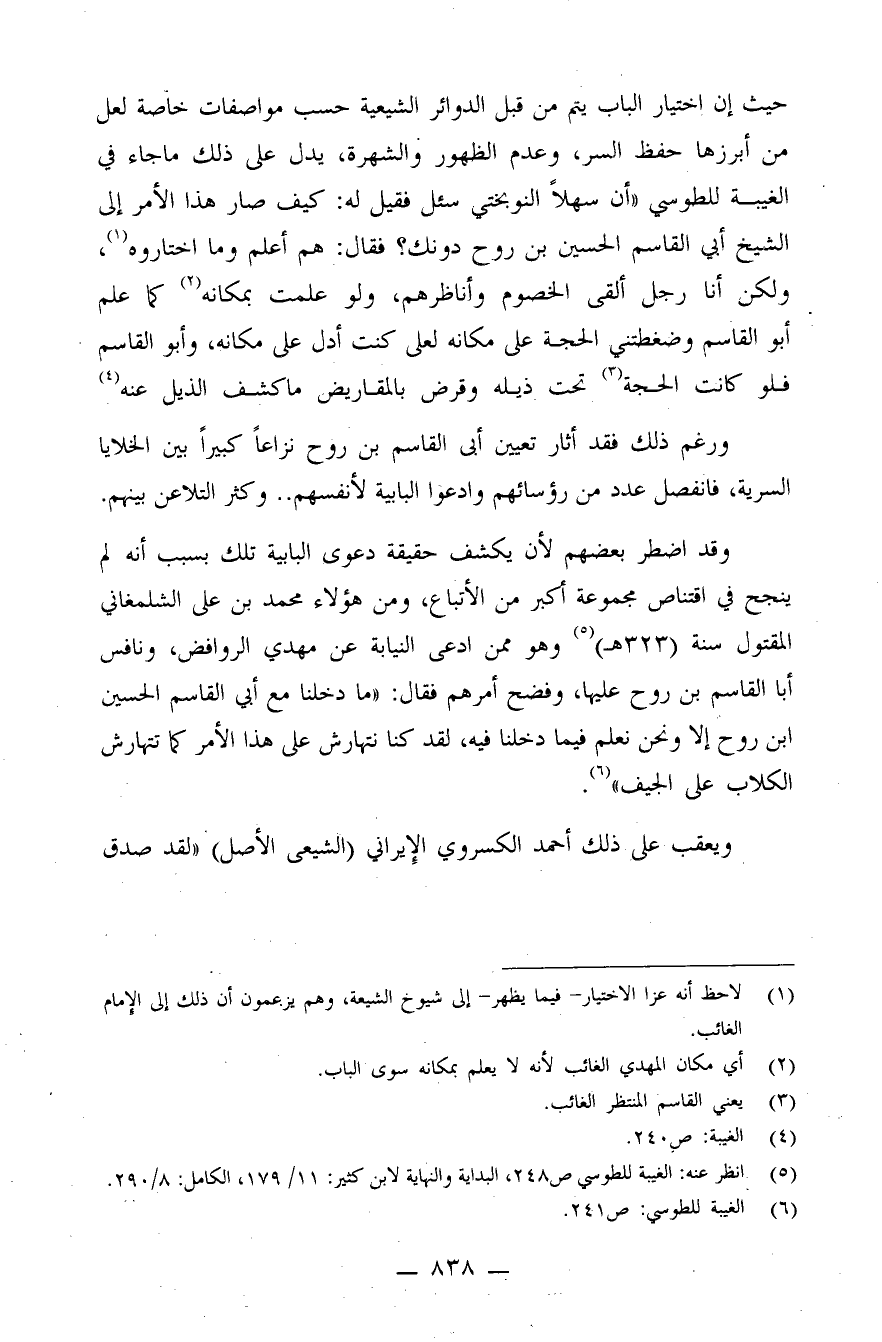 (¬1) لاحظ أنه عزا الاختيار - فيما يظهر - إلى شيوخ الشيعة، وهم يزعمون أن ذلك إلى الإمام الغائب