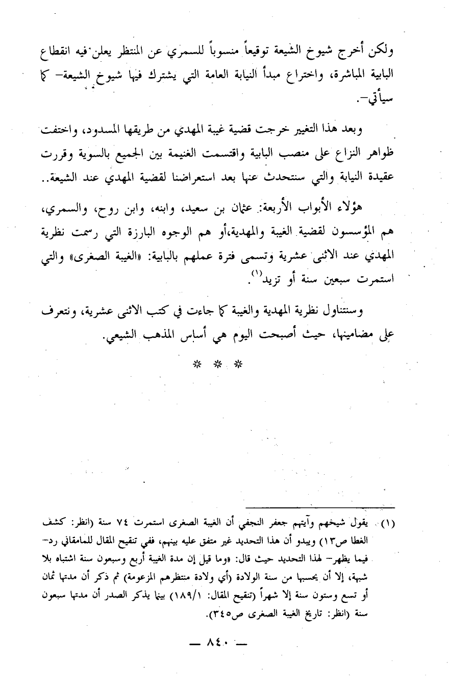 (¬1) يقول شيخهم وآيتهم جعفر النجفي أن الغيبة الصغرى استمرت 74 سنة. (انظر: كشف الغطا: ص13) ويبدو أن هذا التحديد غير متفق عليه بينهم، ففي تنقيح المقال للمامقاني رد - فيما يظهر - لهذا التحديد حيث قال: "وما قيل إن مدة الغيبة أربع وسبعون سنة اشتباه بلا شبهة، إلا أن يحسبها من سنة الولادة" (أي ولادة منتظرهم المزعومة) ثم ذكر أن مدتها ثمان أو تسع وستون سنة إلا شهرًا (تنقيح المقال: 1/189) بينما يذكر الصدر أن مدتها سبعون سنة (انظر: تاريخ الغيبة الصغرى: ص345)