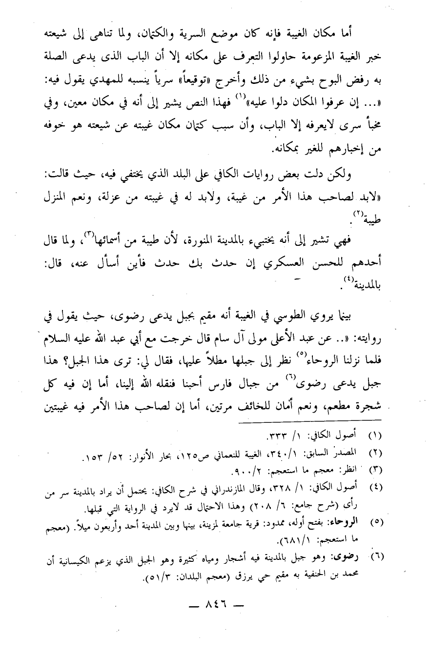 بينما يروي الطوسي في الغيبة أنه مقيم بجبل يدعى رضوى، حيث يقول في روايته: ".. عن عبد الأعلى مولى آل سام قال: خرجت مع أبي عبد الله عليه السلام فلما نزلنا الروحاء (¬5) . نظر إلى جبلها مطلاً عليها، فقال لي: ترى هذا الجبل؟ هذا جبل يدعى رضوى (¬6) . من جبال فارس أحبنا فنقله الله إلينا، أما إن فيه كل شجرة مطعم، ونعم أمان للخائف مرتين، أما إن لصاحب هذا الأمر فيه غيبتين