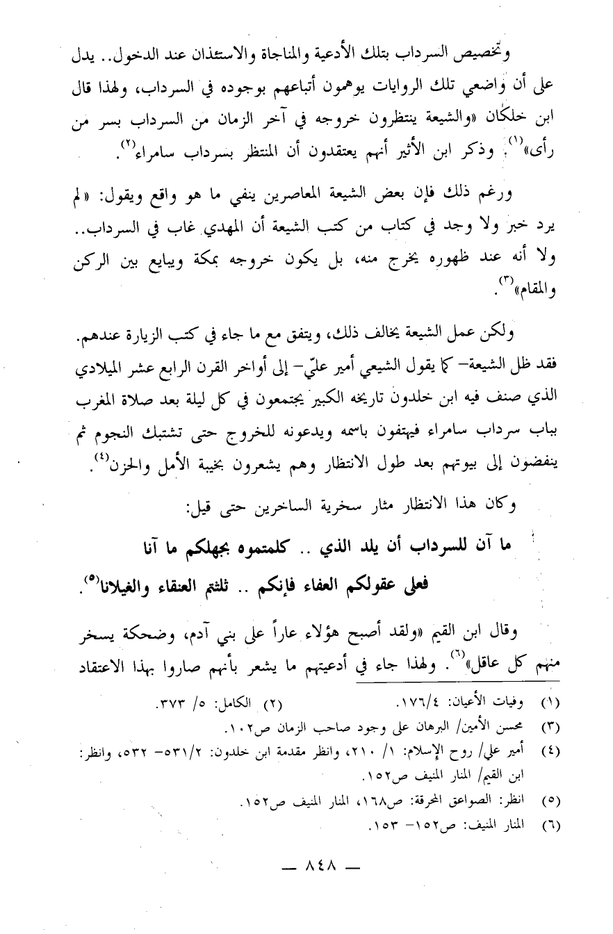 وتخصيص السرداب بتلك الأدعية والمناجاة والاستئذان عند الدخول.. يدل على أن واضعي تلك الروايات يوهمون أتباعهم بوجوده في السرداب، ولهذا قال ابن خلكان: "والشيعة ينتظرون خروجه في آخر الزمان من السرداب بسر من رأى" (¬1) . وذكر ابن الأثير أنهم يعتقدون أن المنتظر بسرداب سامراء (¬2) .