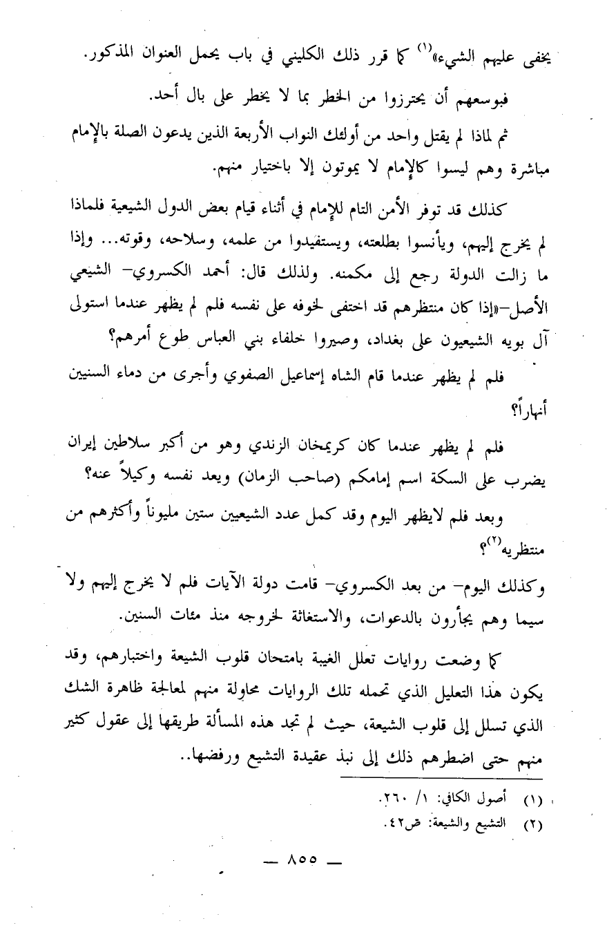 كذلك قد توفر الأمن التام للإمام في أثناء قيام بعض الدول الشيعية فلماذا لم يخرج إليهم، ويأنسوا بطلعته، ويستفيدوا من علمه، وسلاحه، وقوته.. وإذا مازالت الدولة رجع إلى مكمنه؟ ولذلك قال أحمد الكسروي - الشيعي الأصل -: "إذا كان منتظرهم قد اختفى لخوفه على نفسه فلم لم يظهر عندما استولى آل بويه الشيعيون على بغداد، وصيروا خلفاء بني العباس طوع أمرهم؟