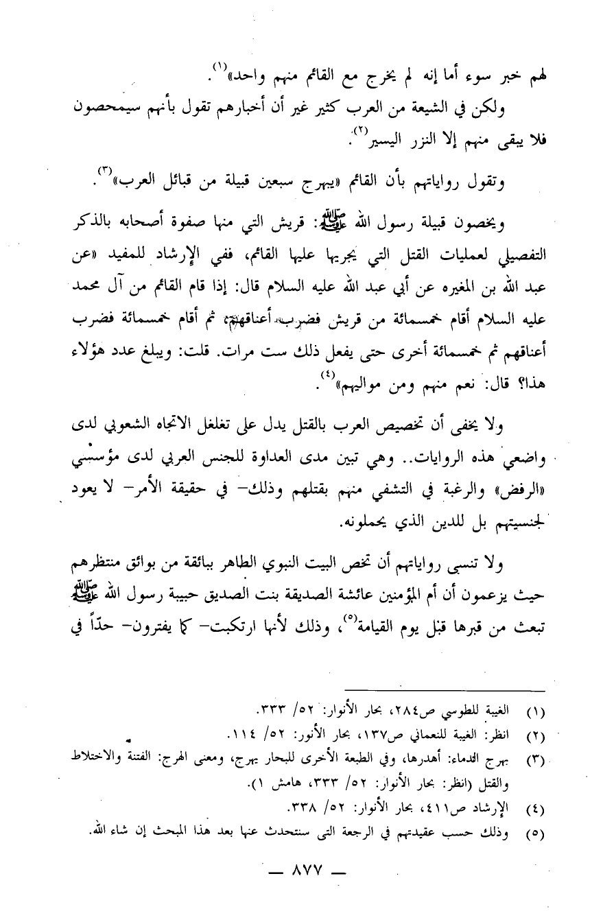 ولا يخفى أن تخصيص العرب بالقتل يدل على تغلغل الاتجاه الشعوبي لدى واضعي هذه الروايات.. وهي تبين مدى العداوة للجنس العربي لدى مؤسسي "الرفض" والرغبة في التشفي منهم بقتلهم، وذلك - في حقيقة الأمر - لا يعود لجنسيتهم بل للدين الذي يحملونه.