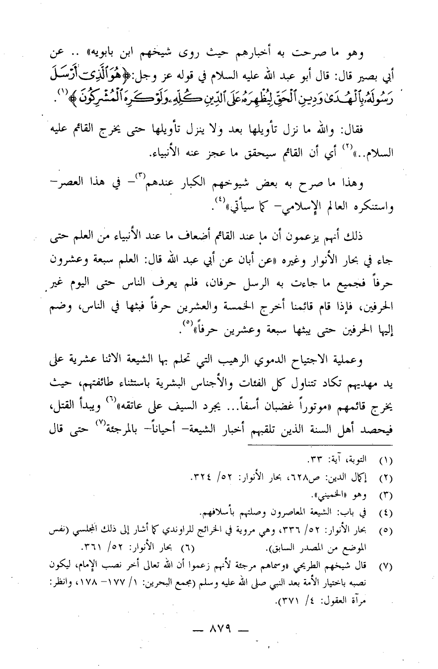 وهو ما صرحت به أخبارهم حيث روى شيخهم ابن بابويه: ".. عن أبي بصير قال: قال أبو عبد الله عليه السلام في قوله عز وجل: {هُوَ الَّذِي أَرْسَلَ رَسُولَهُ بِالْهُدَى وَدِينِ الْحَقِّ لِيُظْهِرَهُ عَلَى الدِّينِ كُلِّهِ وَلَوْ كَرِهَ الْمُشْرِكُونَ} (¬1) .