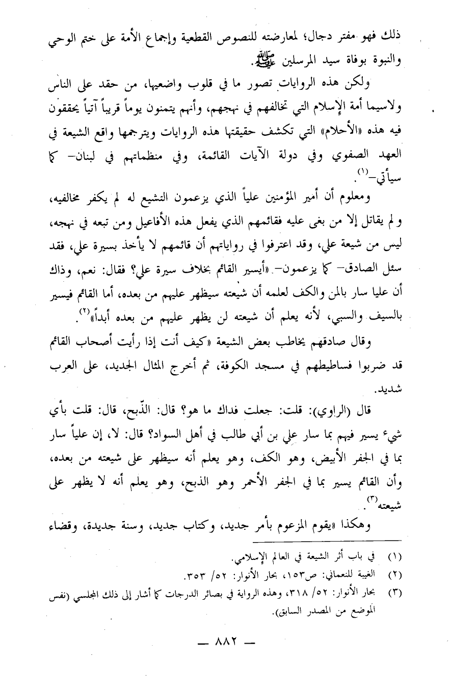 ومعلوم أن أمير المؤمنين عليًا الذي يزعمون التشيع له لم يكفر مخالفيه، ولم يقاتل إلا من بغى عليه، فقائمهم الذي يفعل هذه الأفاعيل ومن تبعه في نهجه، ليس من شيعة علي، وقد اعترفوا في رواياتهم أن قائمهم لا يأخذ بسيرة علي، فقد سئل الصادق - كما يزعمون - "أيسير القائم بخلاف سيرة علي؟ فقال: نعم، وذاك أن عليًا سار بالمن والكف لعلمه أن شيعته سيظهر عليهم من بعده، أما القائم فيسير بالسيف والسبي، لأنه يعلم أن شيعته لن يظهر عليهم من بعده أبدًا" (¬2) .