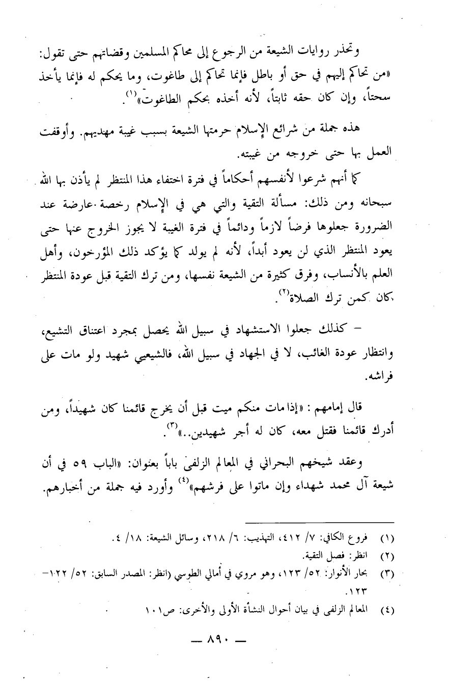 كذلك جعلوا الاستشهاد في سبيل الله يحصل بمجرد اعتناق التشيع، وانتظار عودة الغائب، لا في الجهاد في سبيل الله، فالشيعي شهيد ولو مات على فراشه.