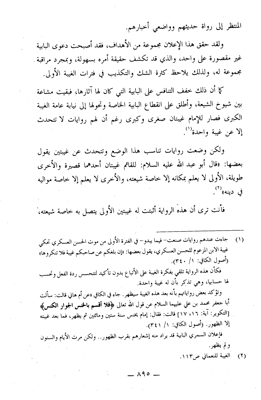 (¬1) جاءت عندهم روايات صنعت - فيما يبدو - في الفترة الأولى من موت الحسن العسكري تحكي غيبة الابن المزعوم للحسن العسكري، يقول بعضها: "إن بلغكم عن صاحبكم غيبة فلا تنكروها" (أصول الكافي: 1/340) .