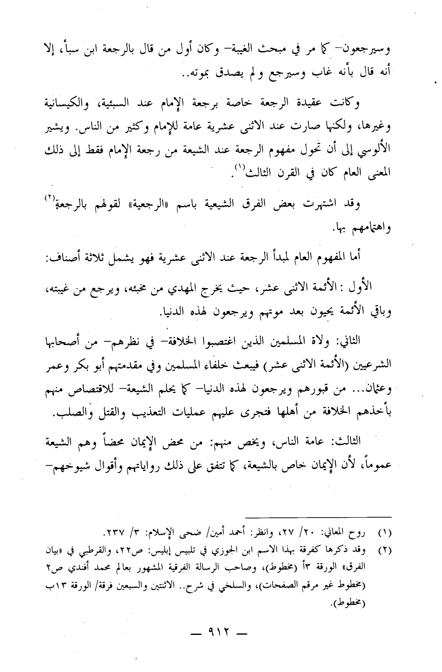وكانت عقيدة الرجعة خاصة برجعة الإمام عند السبئية، والكيسانية وغيرها، ولكنها صارت عند الاثني عشرية عامة للإمام وكثير من الناس. ويشير الألوسي إلى أن تحول مفهوم الرجعة عند الشيعة من رجعة الإمام فقط إلى ذلك المعنى العام كان في القرن الثالث (¬1) .