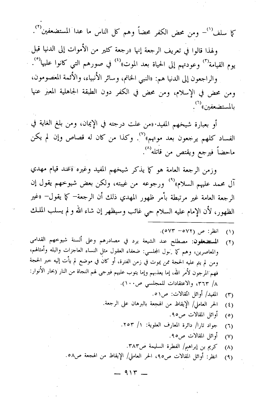 (¬2) المستضعفون: مصطلح عند الشيعة يرد في مصادرهم على ألسنة شيوخهم القدامى والمعاصرين، وهم كما يقول المجلسي: ضعفاء العقول مثل النساء العاجزات والبله وأمثالهم، ومن لم يتم عليه الحجة ممن يموت في زمن الفترة، أو كان في موضع لم يأت غليه خبر الحجة فهم المرجون لأمر الله، إما يعذبهم وإما يتوب عليهم، فيرجى لهم النجاة من النار (بحار الأنوار: 8/363، والاعتقادات للمجلسي: ص100)
