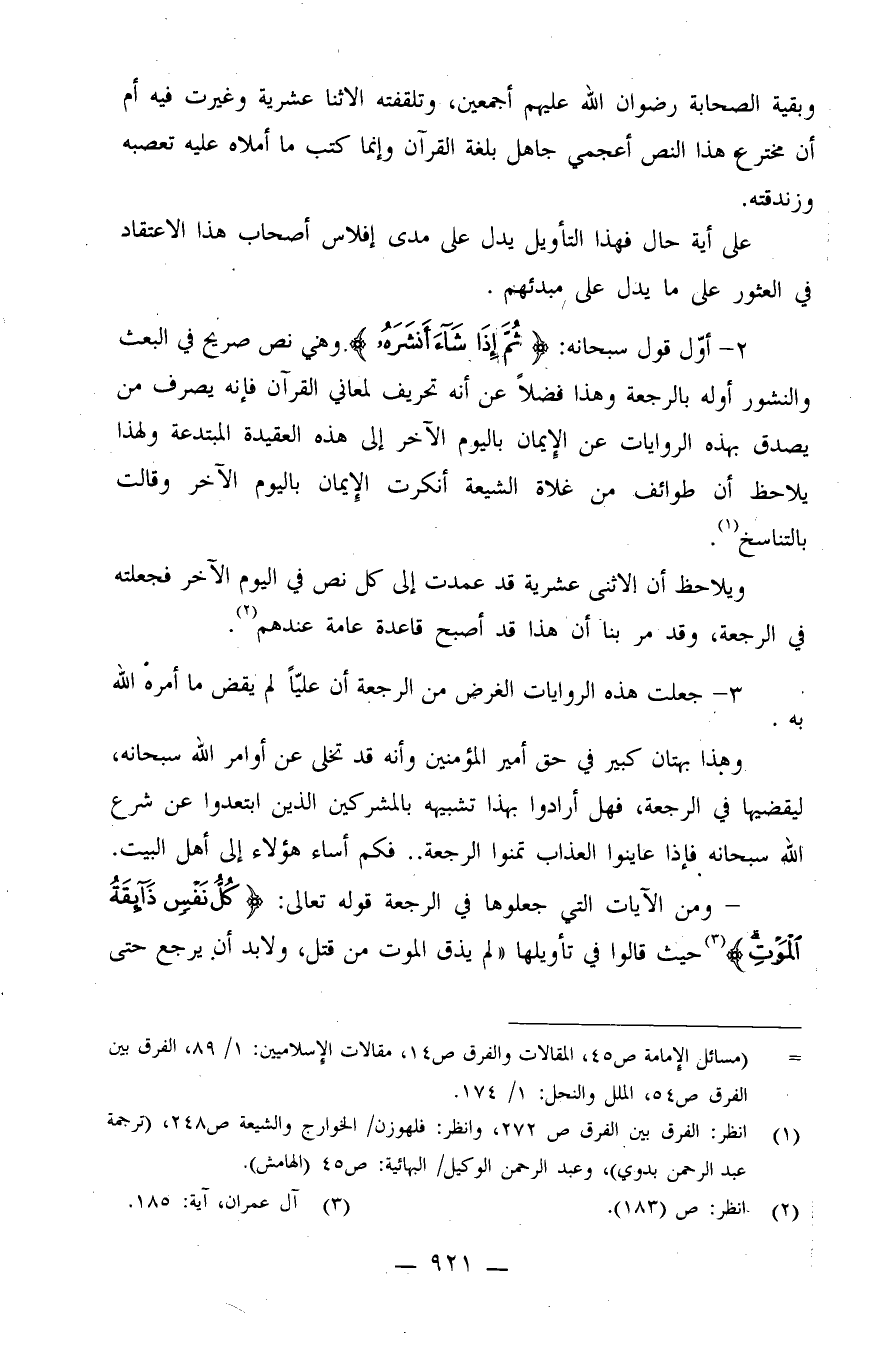 ومن الآيات التي جعلوها في الرجعة قوله تعالى: {كُلُّ نَفْسٍ ذَآئِقَةُ الْمَوْتِ} (¬3) .؛ حيث قالا في تأويلها: "لم يذق الموت من قتل، ولابد أن يرجع حتى
