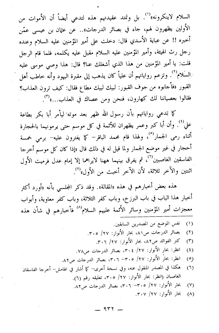 هذه بعض أخبارهم في هذه "المقالة". وقد ذكر المجلسي بأنه "أورد أكثر أخبار هذا الباب في باب البرزخ، وباب كفر الثلاثة، وباب كفر معاوية، وأبواب معجزات أمير المؤمنين وسائل الأئمة عليهم السلام" (¬8) . فأخبارهم في شأن هذه