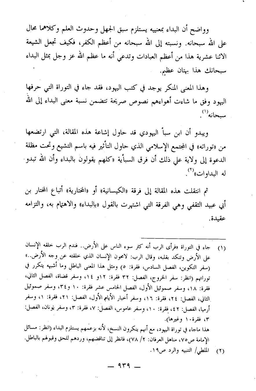 وهذا المعنى المنكر يوجد في كتب اليهود، فقد جاء في التوراة التي حرفها اليهود وفق ما شاءت أهواؤهم نصوص صريحة تتضمن نسبة معنى البداء إلى الله سبحانه (¬1) .