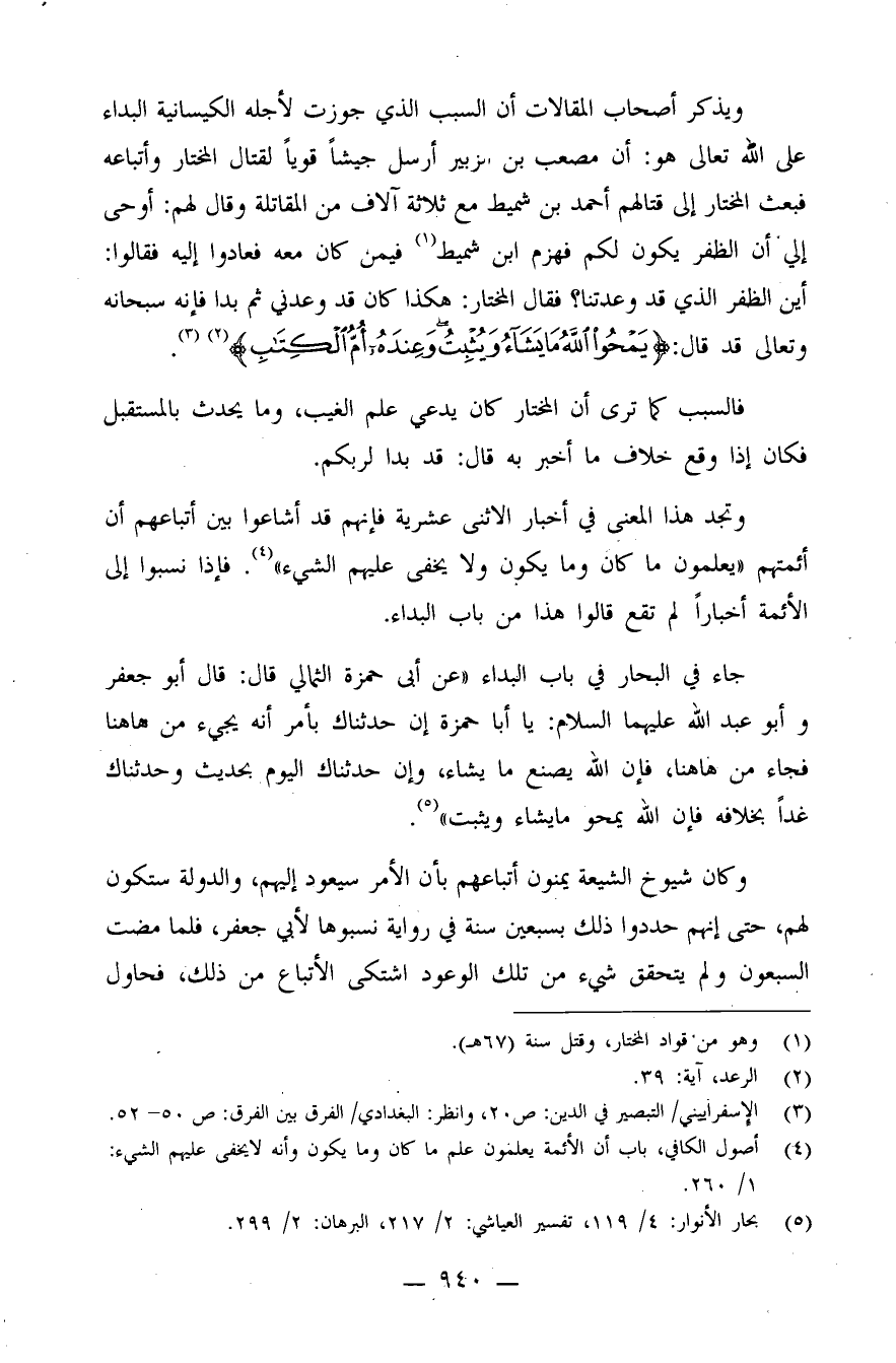 ويذكر أصحاب المقالات أن السبب الذي جوزت لأجله الكيسانية البداء على الله تعالى هو: أن مصعب بن الزبير أرسل جيشًا قويًا لقتال المختار وأتباعه فبعث المختار إلى قتالهم أحمد بن شميط مع ثلاثة آلاف من المقاتلة وقال لهم: أوحي إلي أن الظفر يكون لكم، فهزم ابن شميط (¬1) . فيمن كان معه فعادوا إليه فقالوا: أين الظفر الذي قد وعدتنا؟ فقال المختار: هكذا كان قد وعدني ثم بدا فإنه سبحانه وتعالى قد قال: {يَمْحُو اللهُ مَا يَشَاء وَيُثْبِتُ وَعِندَهُ أُمُّ الْكِتَابِ} (¬2) . (¬3) .