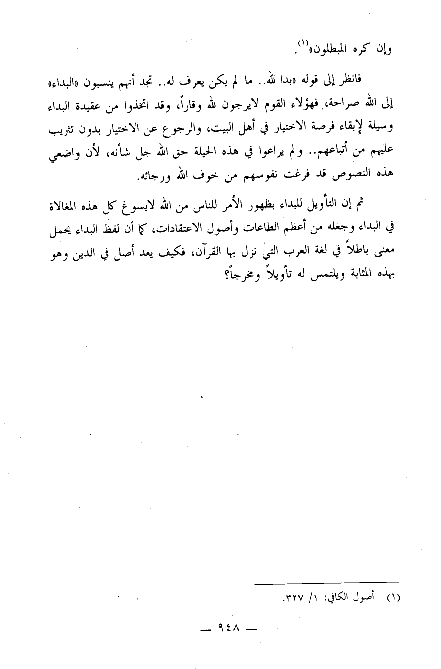 فانظر إلى قوله "بدا لله.. ما يكن يعرف له.." تجد أنهم ينسبون "البداء" إلى الله صراحة، فهؤلاء القوم لا يرجون لله وقارًا، وقد اتخذوا من عقيدة البداء وسيلة لإبقاء فرصة الاختيار في أهل البيت، والرجوع عن الاختيار بدون تثريب عليهم من أتباعهم.. ولم يراعوا في هذه الحيلة حق الله جل شأنه، لأن واضعي هذه النصوص قد فرغت نفوسهم من خوف الله ورجائه. ثم إن التأويل للبداء بظهور الأمر للناس من الله لا يسوغ كل هذه المغالاة في البداء وجعله من أعظم الطاعات وأصول الاعتقادات، كما أن لفظ البداء يحمل معنى باطلاً في لغة العرب التي نزل بها القرآن، فكيف يعد أصل في الدين وهو بهذه المثابة، ويلتمس له تأويل ومخرجٌ؟!