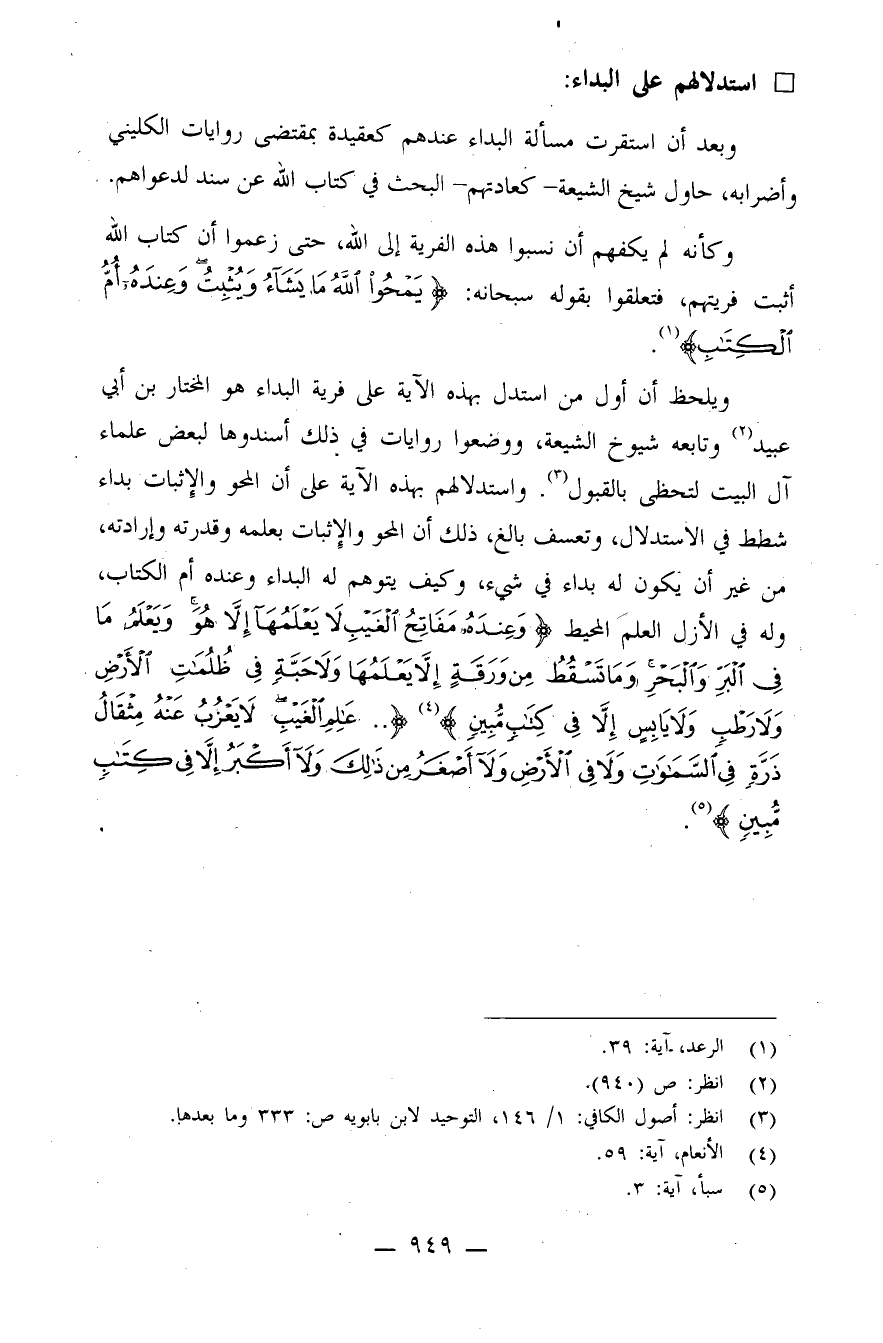 واستدلالهم بهذه الآية على أن المحو والإثبات بداء شطط في الاستدلال، وتعسف بالغ، ذلك أن المحو والإثبات بعلمه وقدرته وإرادته، من غير أن يكون له بداء في شيء، وكيف يتوهم له البداء وعنده أم الكتاب، وله في الأزل العلم المحيط {وَعِندَهُ مَفَاتِحُ الْغَيْبِ لاَ يَعْلَمُهَا إِلاَّ هُوَ وَيَعْلَمُ مَا فِي الْبَرِّ وَالْبَحْرِ وَمَا تَسْقُطُ مِن وَرَقَةٍ إِلاَّ يَعْلَمُهَا وَلاَ حَبَّةٍ فِي ظُلُمَاتِ الأَرْضِ وَلاَ رَطْبٍ وَلاَ يَابِسٍ إِلاَّ فِي كِتَابٍ مُّبِينٍ} (¬4) ، {..وَقَالَ الَّذِينَ كَفَرُوا لَا تَأْتِينَا السَّاعَةُ قُلْ بَلَى وَرَبِّي لَتَأْتِيَنَّكُمْ عَالِمِ الْغَيْبِ لا يَعْزُبُ عَنْهُ مِثْقَالُ ذَرَّةٍ فِي السَّمَاوَاتِ وَلا فِي الأَرْضِ وَلا أَصْغَرُ مِن ذَلِكَ وَلا أَكْبَرُ إِلا فِي كِتَابٍ مُّبِينٍ} (¬5) .