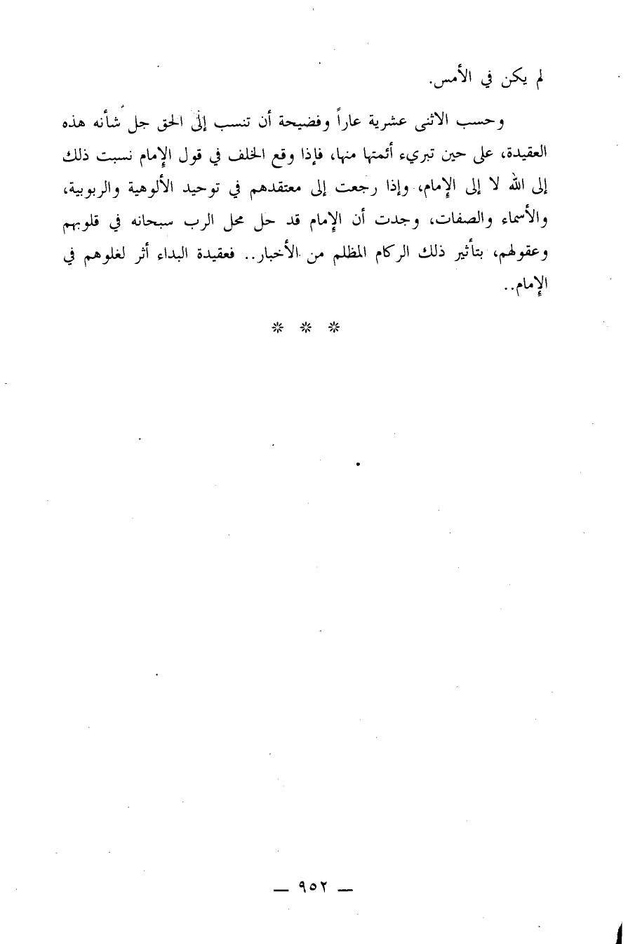 وإذا رجعت إلى معتقدهم في توحيد الألوهية والربوبية، والأسماء والصفات، وجدت أن الإمام قد حل محل الرب سبحانه في قلوبهم وعقولهم، بتأثير ذلك الركام المظلم من الأخبار.. فعقيدة البداء أثر لغلوهم في الإمام.