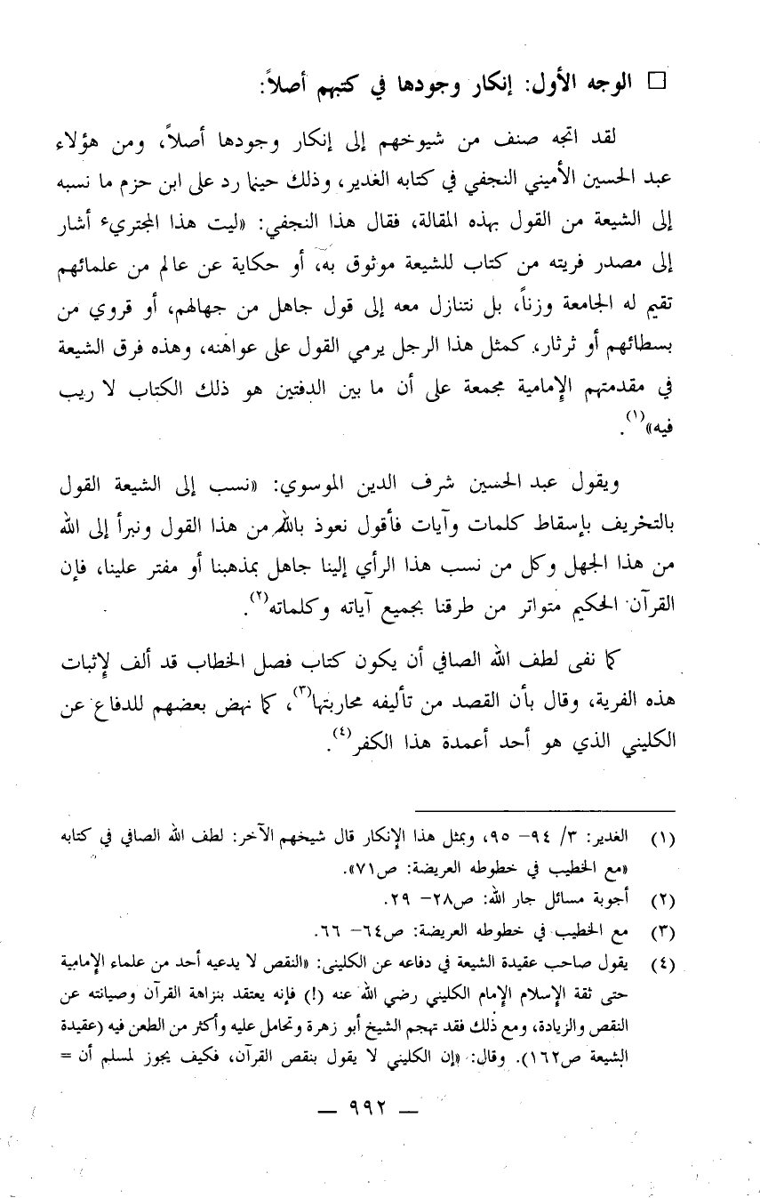 كما نفى لطف الله الصافي أن يكون كتاب فصل الخطاب قد ألف لإثبات هذه الفرية، وقال بأن القصد من تأليفه محاربتها (¬3) ، كما نهض بعضهم للدفاع عن الكليني الذي هو أحد أعمدة هذا الكفر (¬4) .