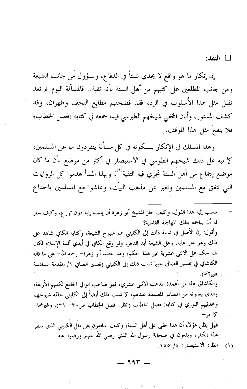 إن إنكار ما هو واقع لا يجدي شيئاً في الدفاع، وسيؤول من جانب الشيعة ومن جانب المطلعين على كتبهم من أهل السنة بأنه تقية.. فالمسألة اليوم لم تعد تقبل مثل هذا الأسلوب في الرد، فقد فضحتهم مطلبع النجف وطهران، وقد كشف المستور، وأبان المخفي شيخهم الطبرسي فيما جمعه في كتابه "فصل الخطاب" فلا ينفع مثل هذا الموقف.