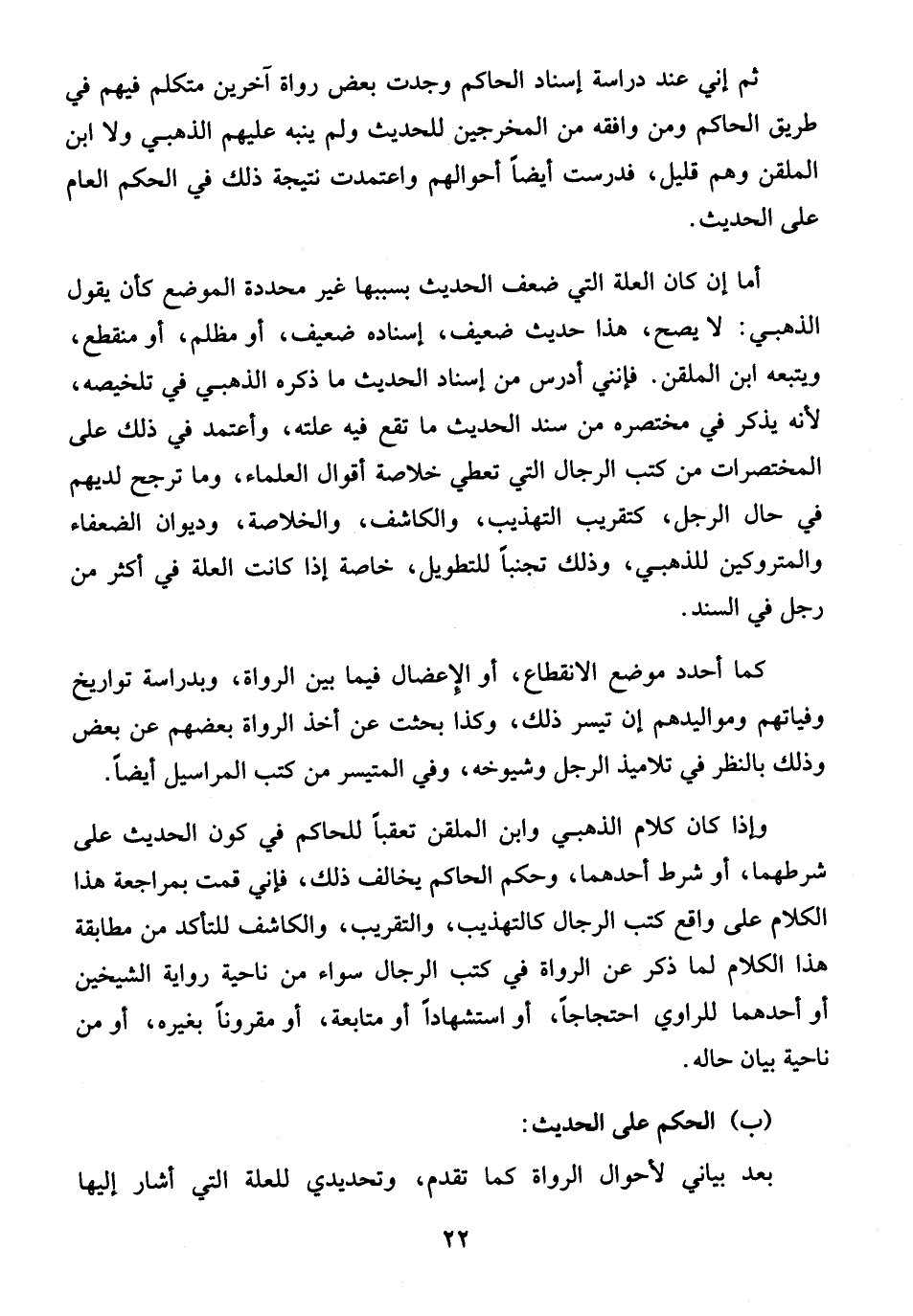 أما إن كان العلة التي ضعف الحديث بسببها غير محددة الموضع كان يقول الذهبي: لا يصح، هذا حديث ضعيف، إسناده ضعيف، أو مظلم، أو منقطع، ويتبعه ابن الملقن. فإنني أدرس من إسناد الحديث ما ذكره الذهبي في تلخيصه، لأنه يذكر في مختصره من سند الحديث ما تقع فيه علته، وأعتمد في ذلك على المختصرات من كتب الرجال التي تعطي خلاصة أقوال العلماء، وما ترجح لديهم في حال الرجل، كتقريب التهذيب، والكاشف، والخلاصة، وديوان الضعفاء والمتروكين للذهبي، وذلك تجنباً للتطويل، خاصة إذا كانت العلة في أكثر من رجل في السند.