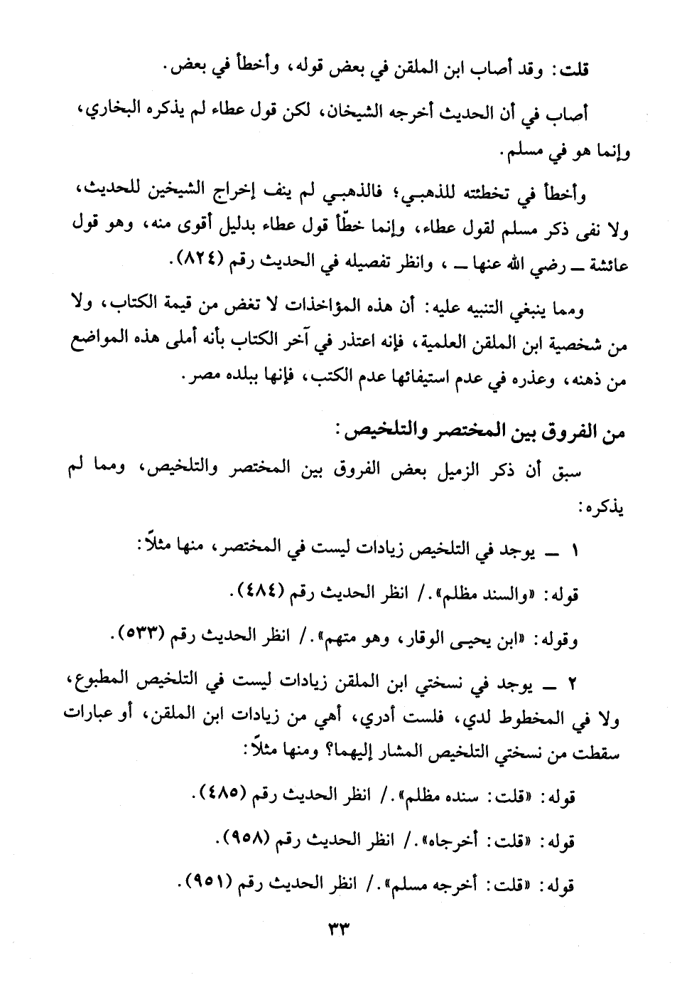 2 - يوجد في نسختي ابن الملقن زيادات ليست في التلخيص المطبوع، ولا في المخطوط لدي، فلست أدري، أهي من زيادات ابن الملقن، أو عبارات سقطت من نسختي التلخيص المشار إليهما؟ ومنها مثلاً: