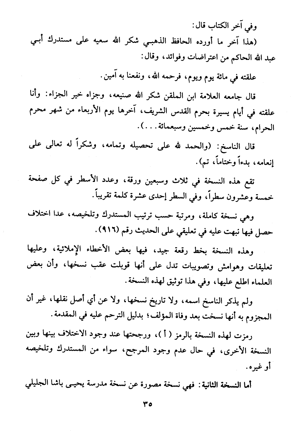 وهي نسخة كاملة، ومرتبة حسب ترتيب المستدرك وتلخيصه، عدا اختلاف حصل فيها نبهت عليه في تعليقي على الحديث رقم (916).