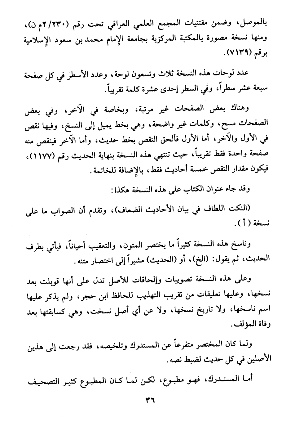 وهناك بعض الصفحات غير مرتبة، وبخاصة في الآخر، وفي بعض الصفحات مسح، وكلمات غير واضحة، وهي بخط يميل إلى النسخ، وفيها نقص في الأول والآخر، أما الأول فالحق النقص بخط حديث، وأما الَآخر فينقص منه صفحة واحدة فقط تقريباً، حيث تنتهي هذه النسخة بنهاية الحديث رقم (1177)، فيكون مقدار النقص خمسة أحاديث فقط، بالإضافة للخاتمة.