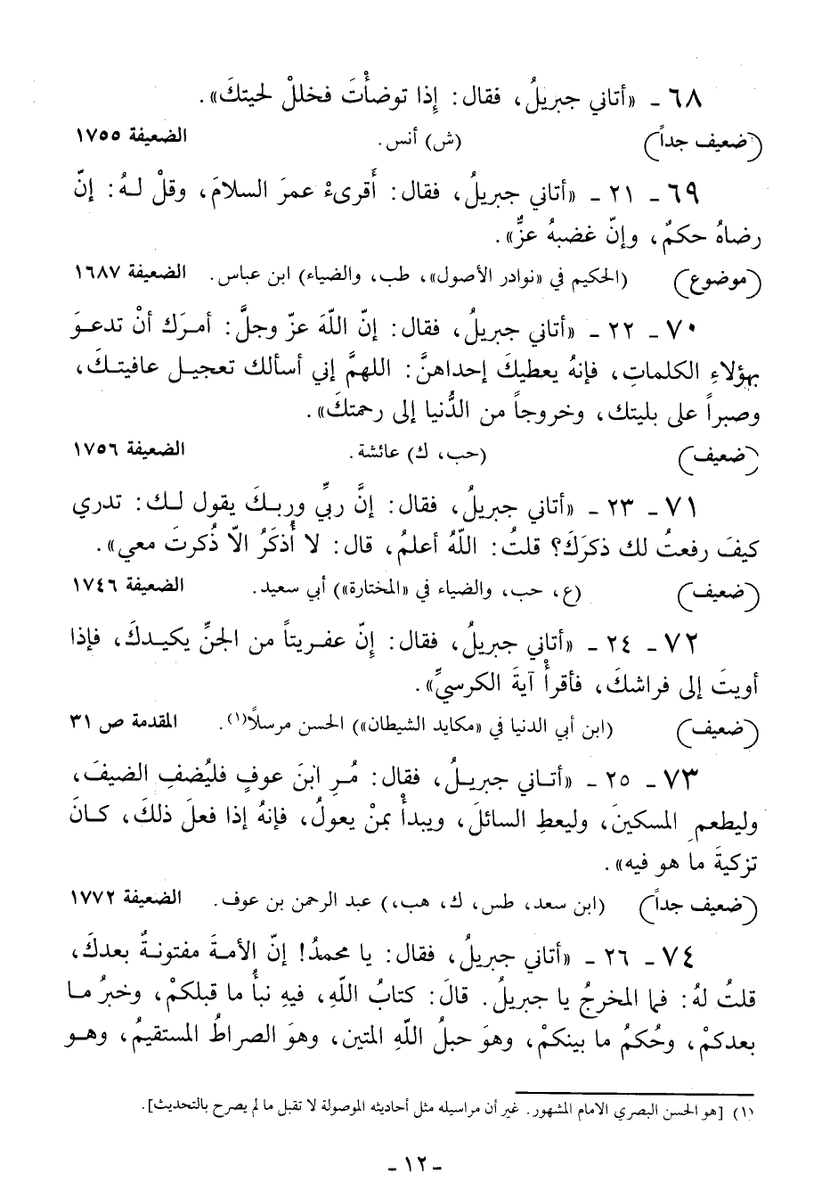 74 - أتاني جبريل فقال: يا محمد! إن الأمة مفتونة بعدك قلت له: فما المخرج يا جبريل قال: كتاب الله فيه نبأ ما قبلكم وخبر ما بعدكم وحكم ما بينكم وهو حبل الله المتين وهو الصراط المستقيم وهو -[13]- قول فصل ليس بالهزل إن هذا القرآن لا يليه من جبار فيعمل بغيره إلا قصمه الله ولا يبتغي علما سواه إلا أضله الله ولا يخلق عن رده وهو الذي لا تفنى عجائبه من يقل به يصدق ومن يحكم به يعدل ومن يعمل به يؤجر ومن يقسم به يقسط