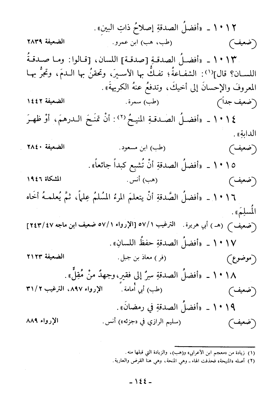 1013 - أفضل الصدقة صدقة اللسان قالوا: وما صدقة اللسان؟ قال الشفاعة تفك بها الأسير وتحقن بها الدم وتجر بها المعروف والإحسان إلى أخيك وتدفع عنه الكريهة