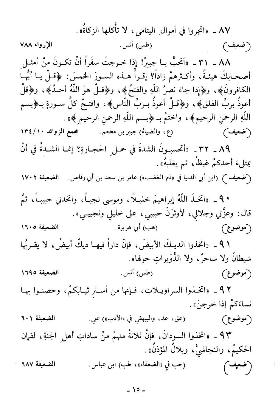 88 - أتحب يا جبير! إذا خرجت سفرا أن تكون من أمثل أصحابك هيئة وأكثرهم زادا؟ اقرأ هذه السور الخمس: {قل يا أيها الكافرون} و {إذا جاء نصر الله والفتح} و {قل هو الله أحد} و {قل أعوذ برب الفلق} و {قل أعوذ برب الناس} وافتح كل سورة بـ {بسم الله الرحمن الرحيم} واختم بـ {بسم الله الرحمن الرحيم}
