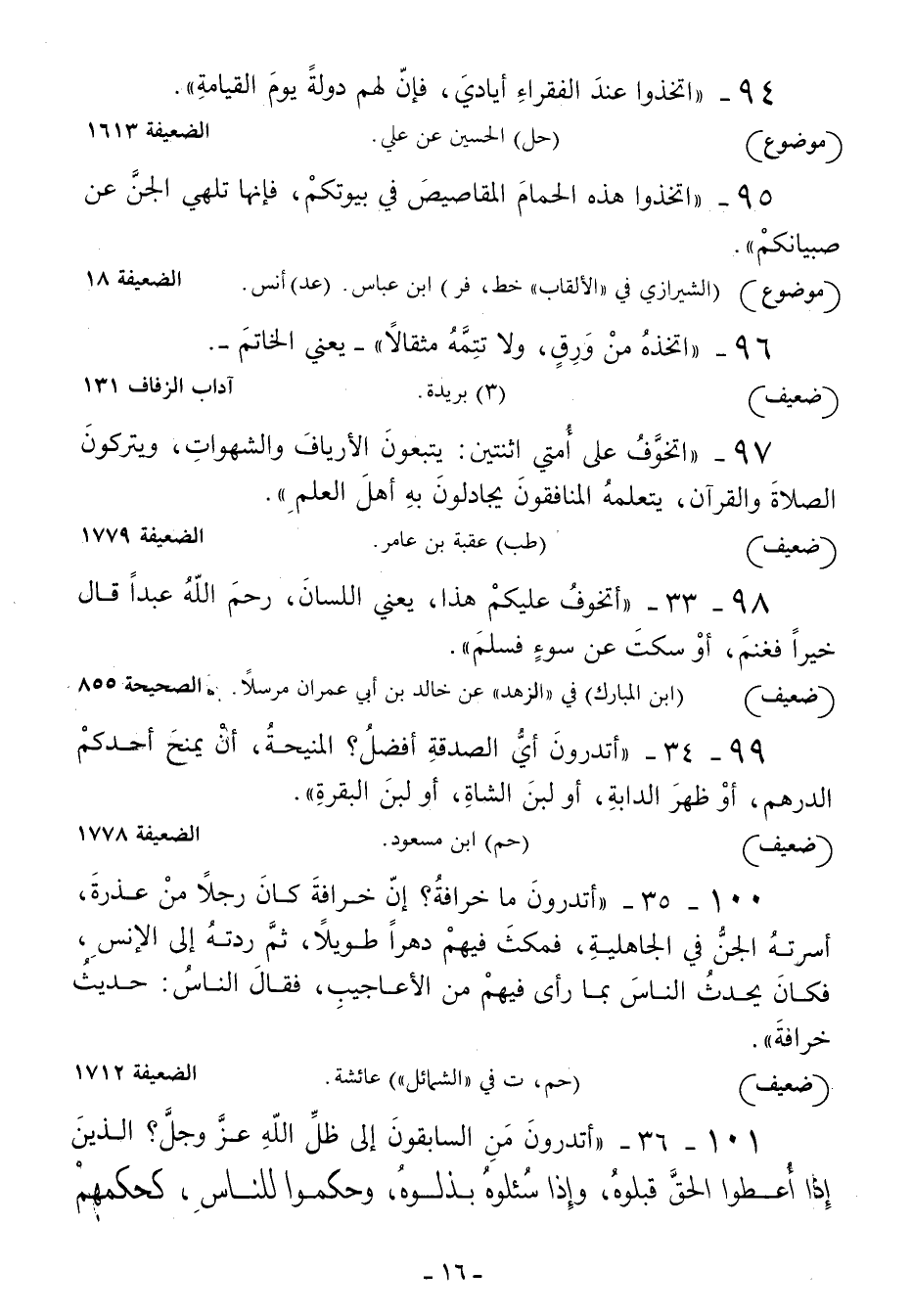 100 - أتدرون ما خرافة؟ إن خرافة كان رجلا من عذرة أسرته الجن في الجاهلية فمكث فيهم دهرا طويلا ثم ردته إلى الإنس فكان يحدث الناس بما رأى فيهم من الأعاجيب فقال الناس: حديث خرافة
