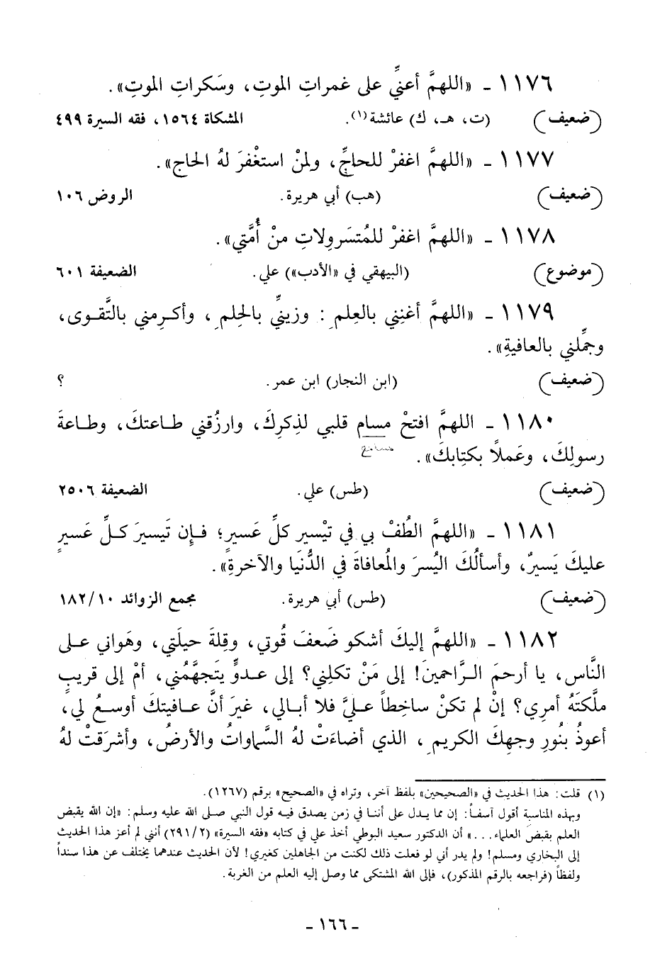 1182 - اللهم إليك أشكو ضعف قوتي وقلة حيلتي وهواني على الناس يا أرحم الراحمين! إلى من تكلني؟ إلى عدو يتجهمني أم إلى قريب ملكته أمري؟ إن لم تكن ساخطا علي فلا أبالي غير أن عافيتك أوسع لي أعوذ بنور وجهك الكريم الذي أضاءت له السموات والأرض وأشرقت له -[167]- الظلمات وصلح عليه أمر الدنيا والآخرة أن تحل علي غضبك أو تنزل علي سخطك ولك العتبى حتى ترضى ولا حول ولا قوة إلا بك