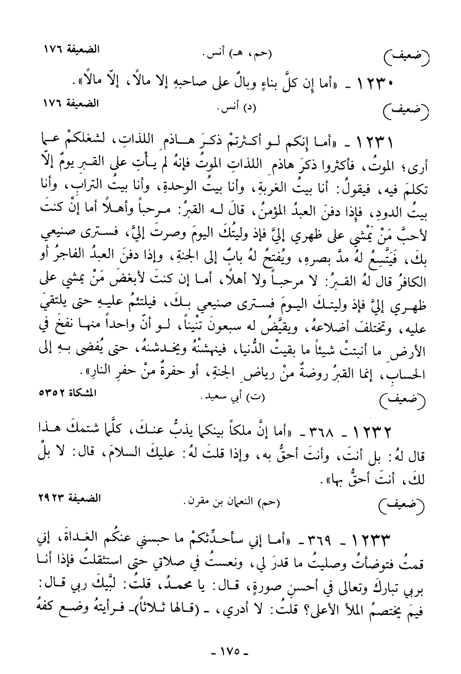 1231 - أما إنكم لو أكثرتم ذكر هاذم اللذات لشغلكم عما أرى الموت فأكثروا ذكر هاذم اللذات الموت فإنه لم يأت على القبر يوم إلا تكلم فيه فيقول: أنا بيت الغربة وأنا بيت الوحدة وأنا بيت التراب وأنا بيت الدود فإذا دفن العبد المؤمن قال له القبر: مرحبا وأهلا أما إن كنت لأحب من يمشي على ظهري إلي فإذ وليتك اليوم وصرت إلي فسترى صنيعي بك فيتسع له مد بصره ويفتح له باب إلى الجنة وإذا دفن العبد الفاجر أو الكافر قال له القبر: لا مرحبا ولا أهلا أما إن كنت لأبغض من يمشي على ظهري إلي فإذ وليتك اليوم فسترى صنيعي بك فيلتئم عليه حتى يلتقي عليه وتختلف أضلاعه ويقيض له سبعون تنينا لو أن واحدا منها نفخ في الأرض ما أنبتت شيئا ما بقيت الدنيا فينهشنه ويخدشنه حتى يفضي به إلى الحساب إنما القبر روضة من رياض الجنة أو حفرة من حفر النار
