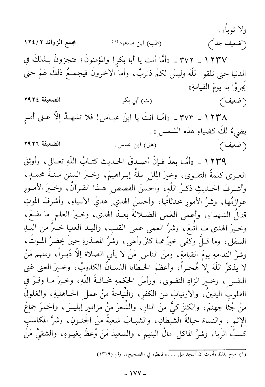 1239 - أما بعد فإن أصدق الحديث كتاب الله تعالى وأوثق العرى كلمة التقوى وخير الملل ملة إبراهيم وخير السنن سنة محمد وأشرف الحديث ذكر الله وأحسن القصص هذا القرآن وخير الأمور عوازمها وشر الأمور محدثاتها وأحسن الهدي هدي الأنبياء وأشرف الموت قتل الشهداء وأعمى العمى الضلالة بعد الهدى وخير العلم ما نفع وخير الهدى ما اتبع وشر العمى عمى القلب واليد العليا خير من اليد السفلى وما قل وكفى خير مما كثر وألهى وشر المعذرة حين يحضر الموت وشر الندامة يوم القيامة ومن الناس من لا يأتي الصلاة إلا دبرا ومنهم من لا يذكر الله إلا هجرا وأعظم الخطايا اللسان الكذوب وخير الغنى غنى النفس وخير الزاد التقوى ورأس الحكمة مخافة الله وخير ما وقر في القلوب اليقين والارتياب من الكفر والنياحة من عمل الجاهلية والغلول من جثا جهنم والكنز كي من النار والشعر من مزامير إبليس والخمر جماع الإثم والنساء حبالة الشيطان والشباب شعبة من الجنون وشر المكاسب كسب الربا وشر المآكل مال اليتيم والسعيد من وعظ بغيره والشقي من -[178]- شقي في بطن أمه وإنما يصير أحدكم إلى موضع أربع أذرع والأمر بآخره وملاك العمل خواتمه وشر الروايا روايا الكذب وكل ما هو آت قريب وسباب المؤمن فسوق وقتال المؤمن كفر وأكل لحمه من معصية الله وحرمة ماله كحرمة دمه ومن يتأل على الله يكذبه ومن يغفر يغفر الله له ومن يعف يعف الله عنه ومن يكظم الغيظ يأجره الله ومن يصبر على الرزية يعوضه الله ومن يتبع السمعة يسمع الله به ومن يصبر يضعف الله له ومن يعص الله يعذبه الله اللهم اغفر لي ولأمتي اللهم اغفر لي ولأمتي اللهم اغفر لي ولأمتي أستغفر الله لي ولكم