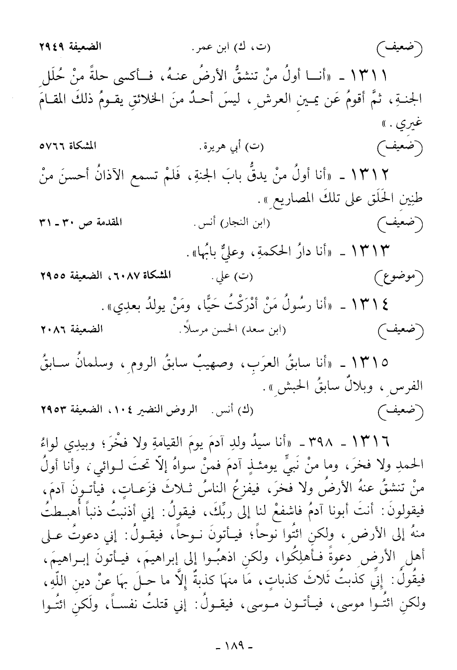 1316 - أنا سيد ولد آدم يوم القيامة ولا فخر وبيدي لواء الحمد ولا فخر وما من نبي يومئذ آدم فمن سواه إلا تحت لوائي وأنا أول من تنشق عنه الأرض ولا فخر فيفزع الناس ثلاث فزعات فيأتون آدم فيقولون: أنت أبونا آدم فاشفع لنا إلى ربك فيقول: إني أذنبت ذنبا أهبطت منه إلى الأرض ولكن ائتوا نوحا فيأتون نوحا فيقول: إني دعوت على أهل الأرض دعوة فأهلكوا ولكن اذهبوا إلى إبراهيم فيأتون إبراهيم فيقول: إني كذبت ثلاث كذبات ما منها كذبة إلا ما حل بها عن دين الله ولكن ائتوا موسى فيأتون موسى فيقول: إني قتلت نفسا ولكن ائتوا -[190]- عيسى فيأتون عيسى فيقول: إني عبدت من دون الله ولكن ائتوا محمدا فيأتوني فأنطلق معهم فآخذ بحلقة باب الجنة فأقعقعها فيقال: من هذا؟ فأقول: محمد فيفتحون لي ويرحبون فيقولون: مرحبا فأخر ساجدا فيلهمني الله من الثناء والحمد فيقال لي: ارفع رأسك سل تعطه واشفع تشفع وقل: يسمع لقولك وهو المقام المحمود الذي قال الله {عسى أن يبعثك ربك مقاما محمودا}