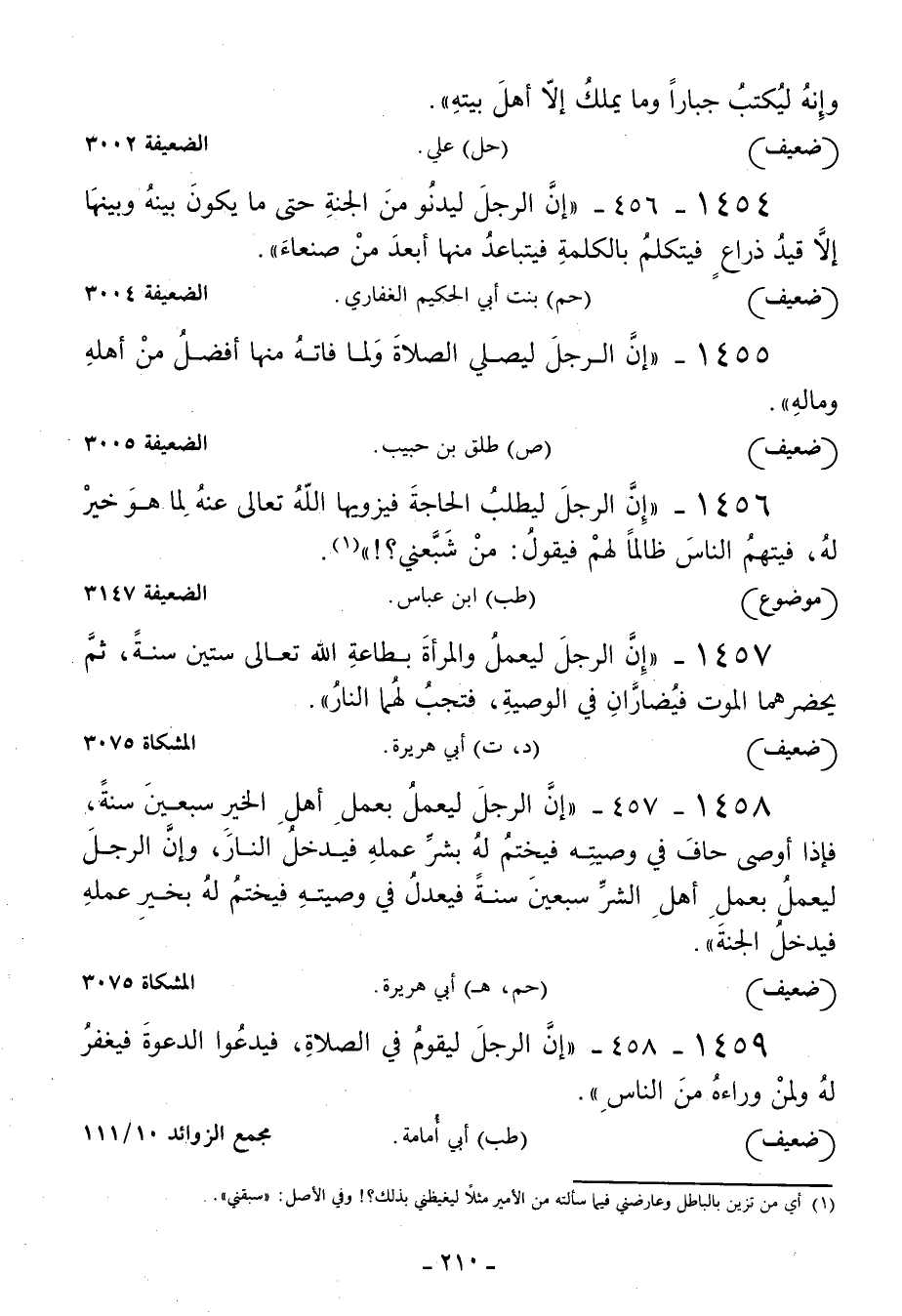 1458 - إن الرجل ليعمل بعمل أهل الخير سبعين سنة فإذا أوصى حاف في وصيته فيختم له بشر عمله فيدخل النار وإن الرجل ليعمل بعمل أهل الشر سبعين سنة فيعدل في وصيته فيختم له بخير عمله فيدخل الجنة تخريج السيوطي (حم هـ) عن أبي هريرة. تحقيق الألباني (ضعيف)