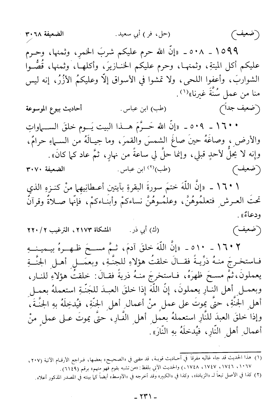 1599 - إن الله حرم عليكم شرب الخمر وثمنها وحرم عليكم أكل الميتة وثمنها وحرم عليكم الخنازير وأكلها وثمنها قصوا الشوارب وأعفوا اللحى ولا تمشوا في الأسواق إلا وعليكم الأزر إنه ليس منا من عمل سنة غيرنا