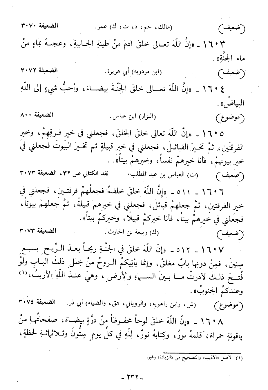 1608 - إن الله خلق لوحا محفوظا من درة بيضاء صفحاتها من ياقوتة حمراء قلمه نور وكتابه نور لله في كل يوم ستون وثلاثمائة لحظة -[233]- يخلق ويرزق ويميت ويحيي ويعز ويذل ويفعل ما يشاء