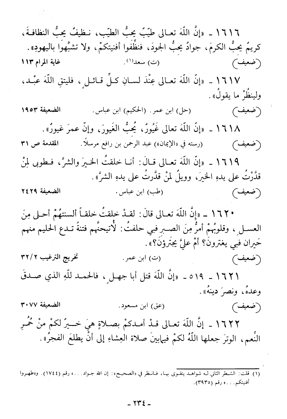 1616 - إن الله تعالى طيب يحب الطيب نظيف يحب النظافة كريم يحب الكرم جواد يحب الجود فنظفوا أفنيتكم ولا تشبهوا باليهود