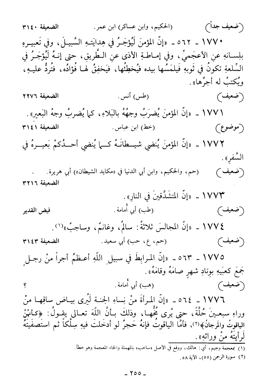 1770 - إن المؤمن ليؤجر في هدايته السبيل وفي تعبيره بلسانه عن الأعجمي وفي إماطة الأذى عن الطريق حتى إنه ليؤجر في السلعة تكون في ثوبه فيلمسها بيده فيخطئها فيخفق لها فؤاده فترد عليه ويكتب له أجرها