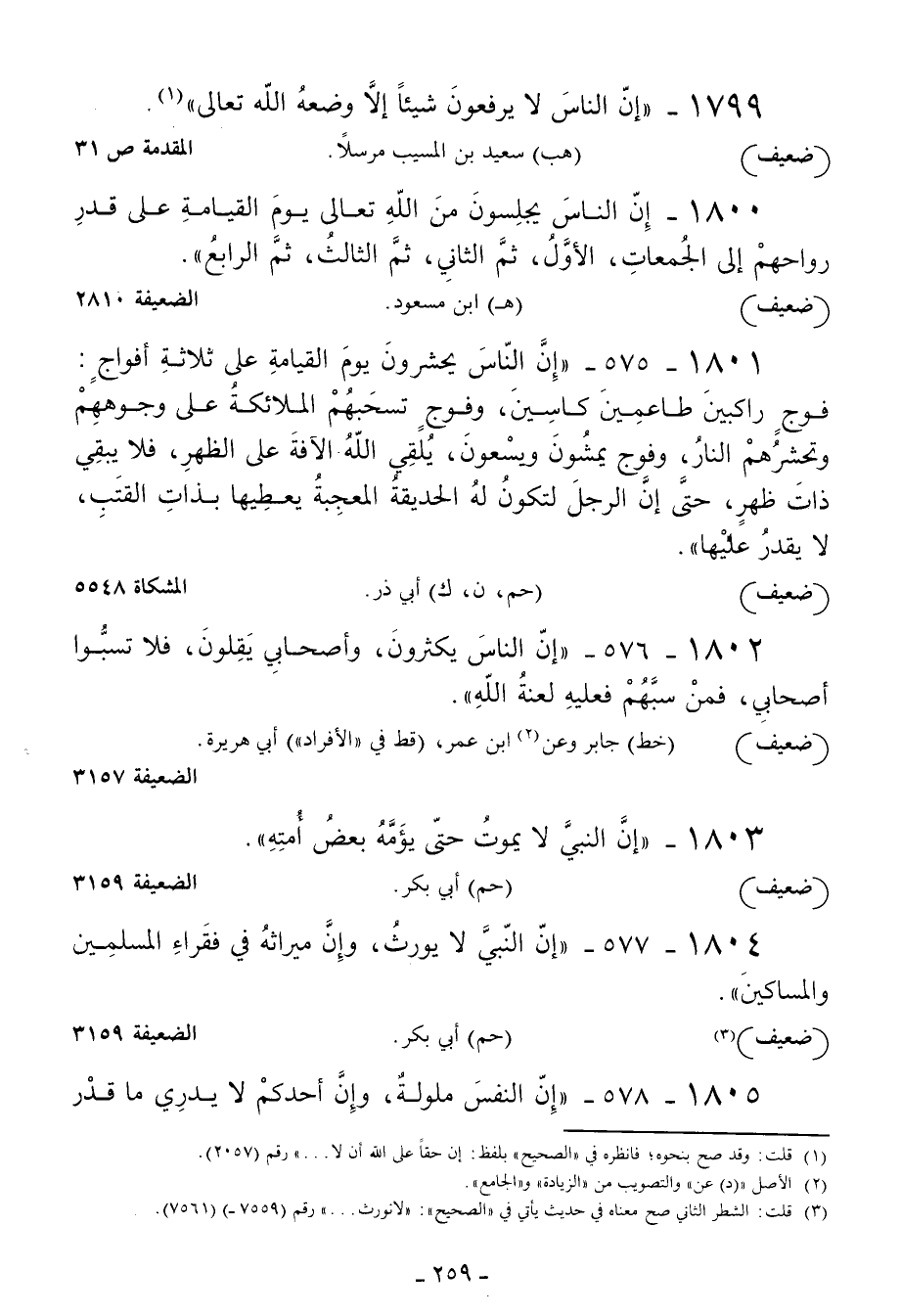 1801 - إن الناس يحشرون يوم القيامة على ثلاثة أفواج: فوج راكبين طاعمين كاسين وفوج تسحبهم الملائكة على وجوههم وتحشرهم النار وفوج يمشون ويسعون يلقي الله الآفة على الظهر فلا يبقى ذات ظهر حتى إن الرجل لتكون له الحديقة المعجبة يعطيها بذات القتب لا يقدر عليها