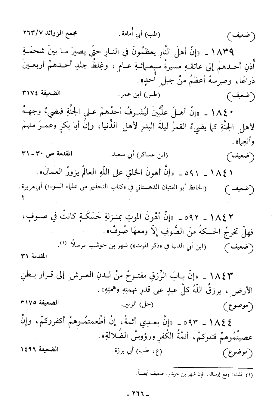 1839 - إن أهل النار يعظمون في النار حتى يصير ما بين شحمة أذن أحدهم إلى عاتقه مسيرة سبعمائة عام وغلظ جلد أحدهم أربعين ذراعا وضرسه أعظم من جبل أحد