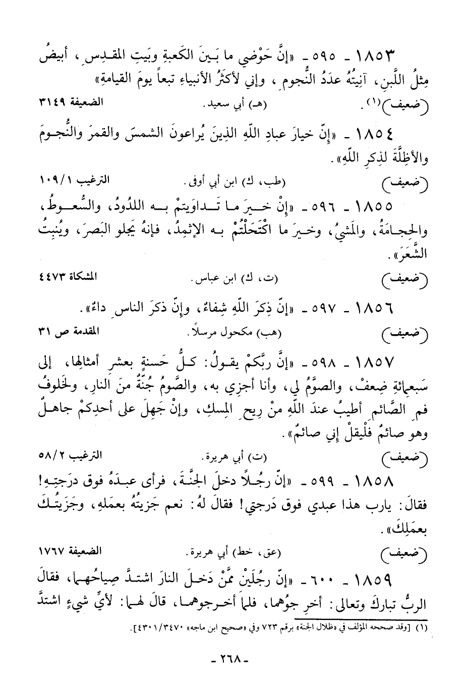 1859 - إن رجلين ممن دخل النار اشتد صياحهما فقال الرب تبارك وتعالى: أخرجوهما فلما أخرجوهما قال لهما: لأي شيء اشتد -[269]- صياحكما؟ قالا: فعلنا ذلك لترحمنا قال: رحمتي لكما أن تنطلقا فتلقيا أنفسكما حيث كنتما من النار فينطلقان فيلقي أحدهما نفسه فيجعلها عليه بردا وسلاما ويقوم الآخر فلا يلقي نفسه فيقول له الرب: ما منعك أن تلقي نفسك كما ألقى صاحبك؟ فيقول: يا رب إني لأرجو أن لا تعيدني فيها بعد ما أخرجتني فيقول له الرب: لك رجاؤك فيدخلان الجنة جميعا برحمة الله