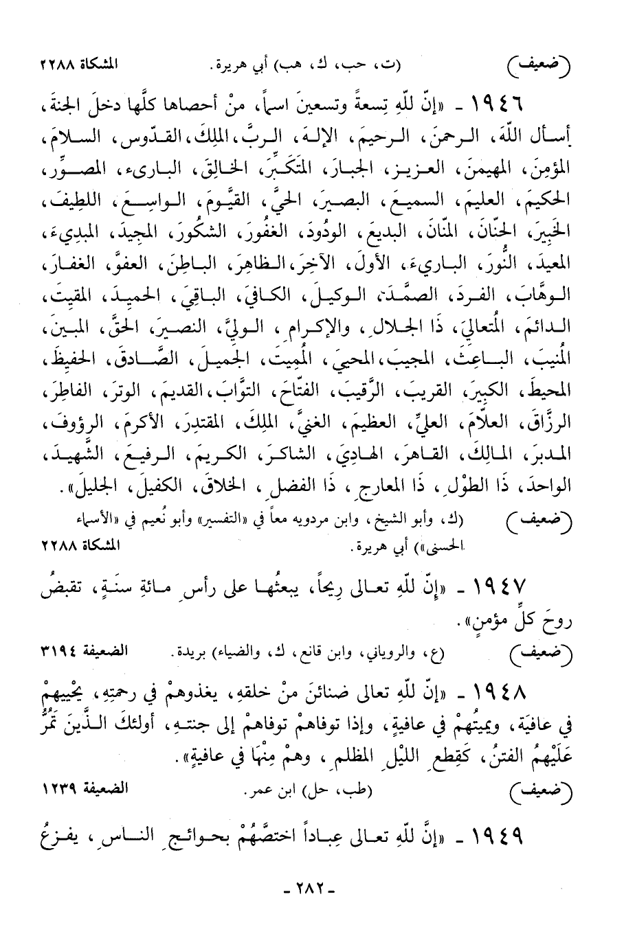 1946 - إن لله تسعة وتسعين اسما من أحصاها كلها دخل الجنة أسأل الله الرحمن الرحيم الإله الرب الملك القدوس السلام المؤمن المهيمن العزيز الجبار المتكبر الخالق البارئ المصور الحكيم العليم السميع البصير الحي القيوم الواسع اللطيف الخبير الحنان المنان البديع الودود الغفور الشكور المجيد المبدئ المعيد النور البارئ الأول الآخر الظاهر الباطن العفو الغفار الوهاب الفرد الصمد الوكيل الكافي الباقي الحميد المقيت الدائم المتعالي ذا الجلال والإكرام الولي النصير الحق المبين المنيب الباعث المجيب المحيي المميت الجميل الصادق الحفيظ المحيط الكبير القريب الرقيب الفتاح التواب القديم الوتر الفاطر الرزاق العلام العلي العظيم الغني الملك المقتدر الأكرم الرءوف المدبر المالك القاهر الهادي الشاكر الكريم الرفيع الشهيد الواحد ذا الطول ذا المعارج ذا الفضل الخلاق الكفيل الجليل