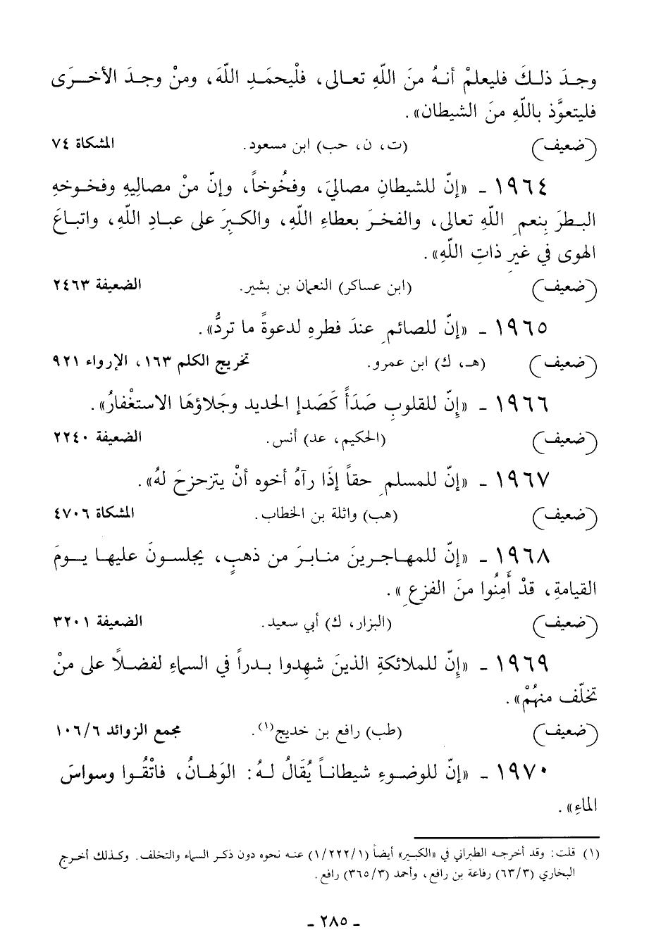 1964 - إن للشيطان مصالي وفخوخا وإن من مصاليه وفخوخه البطر بنعم الله تعالى والفخر بعطاء الله والكبر على عباد الله واتباع الهوى في غير ذات الله