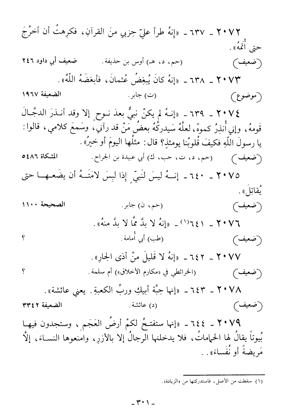 2079 - إنها ستفتح لكم أرض العجم وستجدون فيها بيوتا يقال لها الحمامات فلا يدخلنها الرجال إلا بالأزر وامنعوها النساء إلا مريضة أو نفساء -[302]-