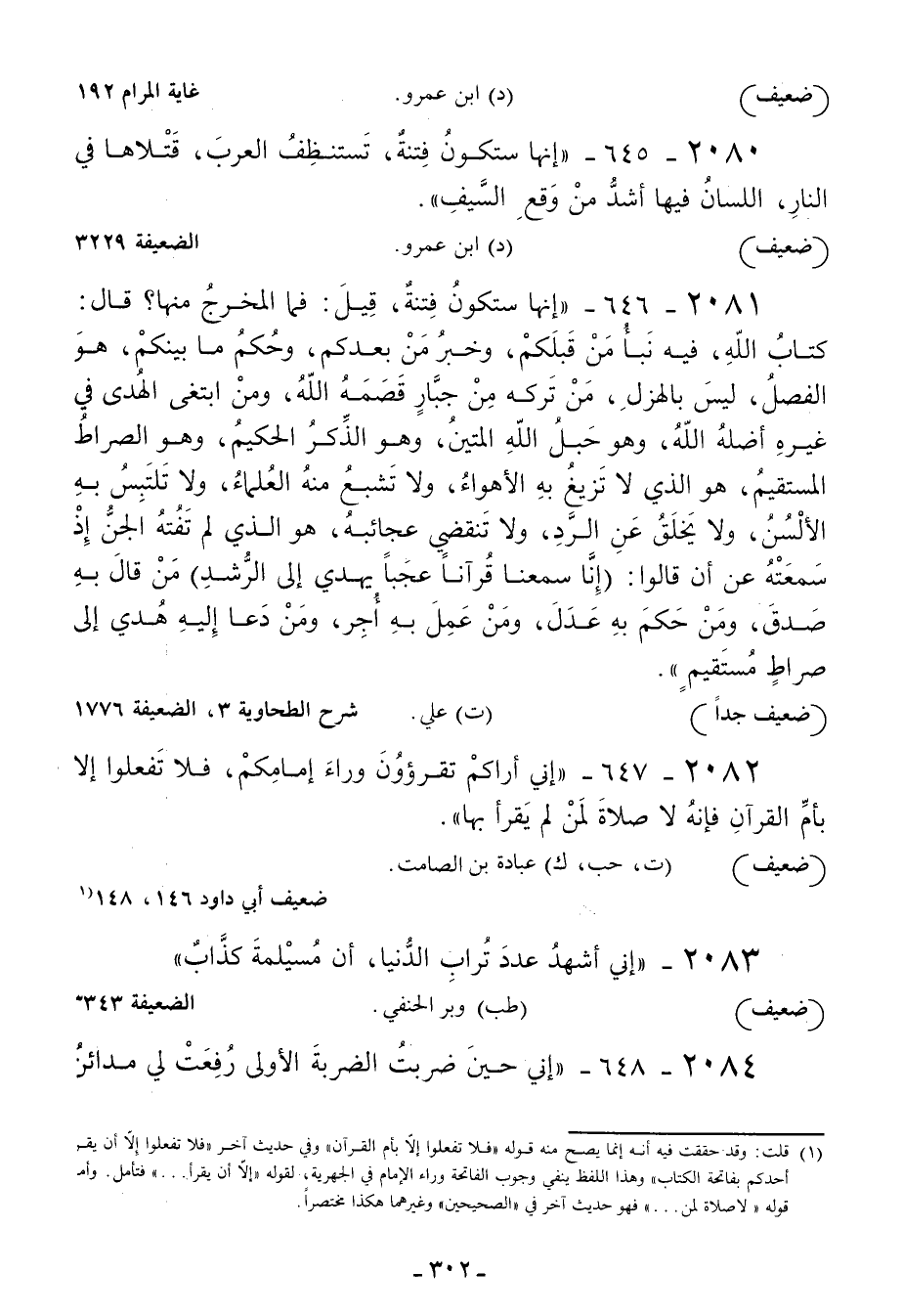 2081 - إنها ستكون فتنة قيل: فما المخرج منها؟ قال: كتاب الله فيه نبأ من قبلكم وخبر من بعدكم وحكم ما بينكم هو الفصل ليس بالهزل من تركه من جبار قصمه الله ومن ابتغى الهدى في غيره أضله الله وهو حبل الله المتين وهو الذكر الحكيم وهو الصراط المستقيم هو الذي لا تزيغ به الأهواء ولا تشبع منه العلماء ولا تلتبس به الألسن ولا يخلق عن الرد ولا تنقضي عجائبه هو الذي لم تفته الجن إذ سمعته عن أن قالوا: {إنا سمعنا قرآنا عجبا يهدي إلى الرشد} من قال به صدق ومن حكم به عدل ومن عمل به أجر ومن دعا إليه هدي إلى صراط المستقيم