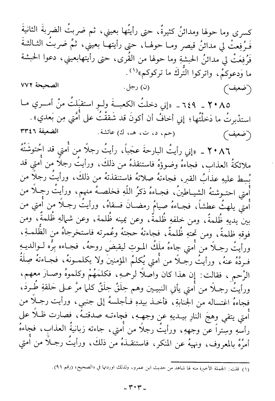 2086 - إني رأيت البارحة عجبا رأيت رجلا من أمتي قد احتوشته ملائكة العذاب فجاءه وضوءه فاستنقذه من ذلك ورأيت رجلا من أمتي قد بسط عليه عذاب القبر فجاءته صلاته فاستنقذته من ذلك ورأيت رجلا من أمتي احتوشته الشياطين فجاءه ذكر الله فخلصه منهم ورأيت رجلا من أمتي يلهث عطشا فجاءه صيام رمضان فسقاه ورأيت رجلا من أمتي من بين يديه ظلمة ومن خلفه ظلمة وعن يمينه ظلمة وعن شماله ظلمة ومن فوقه ظلمة ومن تحته ظلمة فجاءته حجته وعمرته فاستخرجاه من الظلمة ورأيت رجلا من أمتي جاءه ملك الموت ليقبض روحه فجاءه بره لوالديه فرده عنه ورأيت رجلا من أمتي يكلم المؤمنين ولا يكلمونه فجاءته صلة الرحم فقالت: إن هذا كان واصلا لرحمه فكلمهم وكلموه وصار معهم ورأيت رجلا من أمتي يأتي النبيين وهم حلق حلق كلما مر على حلقة طرد فجاءه اغتساله من الجنابة فأخذ بيده فأجلسه إلى جنبي ورأيت رجلا من أمتي يتقي وهج النار بيديه عن وجهه فجاءته صدقته فصارت ظلا على رأسه وسترا عن وجهه ورأيت رجلا من أمتي جاءته زبانية العذاب فجاءه أمره بالمعروف ونهيه عن المنكر فاستنقذه من ذلك ورأيت رجلا من أمتي -[304]- هوى في النار فجاءته دموعه اللاتي بكى بها في الدنيا من خشية الله فأخرجته من النار ورأيت رجلا من أمتي قد هوت صحيفته إلى شماله فجاءه خوفه من الله تعالى فأخذ صحيفته فجعلها في يمينه ورأيت رجلا من أمتي قد خف ميزانه فجاءه أفراطه فثقلوا ميزانه ورأيت رجلا من أمتي على شفير جهنم فجاءه وجله من الله تعالى فاستنقذه من ذلك ورأيت رجلا من أمتي يرعد كما ترعد السعفة فجاءه حسن ظنه بالله تعالى فسكن رعدته ورأيت رجلا من أمتي يزحف على الصراط مرة ويحبو مرة فجاءته صلاته علي فأخذت بيده فأقامته على الصراط حتى جاز ورأيت رجلا 4 من أمتي انتهى إلى أبواب الجنة فغلقت الأبواب دونه فجاءته شهادة أن لا إله إلا الله فأخذت بيده فأدخلته الجنة