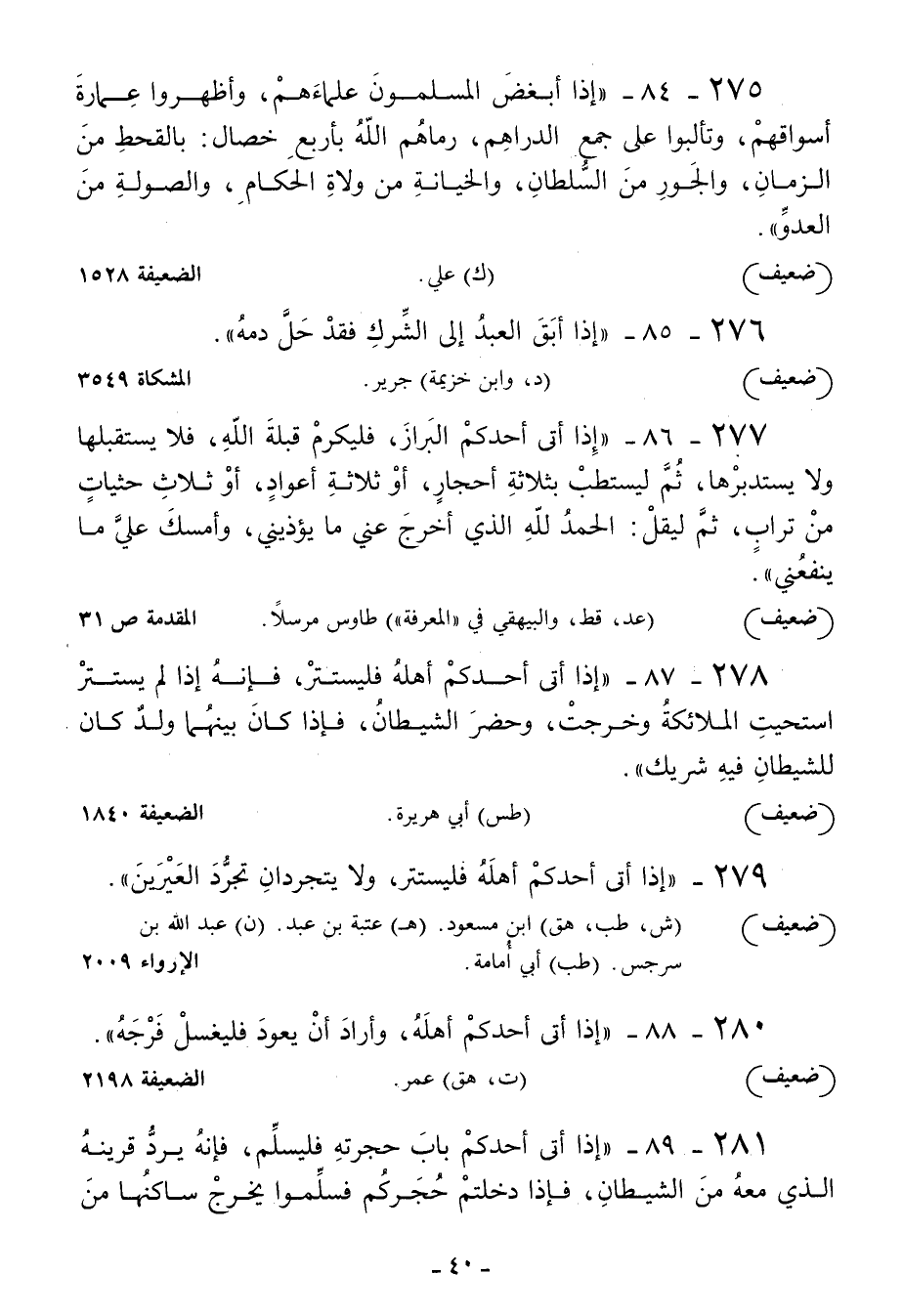 281 - إذا أتى أحدكم باب حجرته فليسلم فإنه يرد قرينه الذي معه من الشيطان فإذا دخلتم حجركم فسلموا يخرج ساكنها من -[41]- الشيطان وإذا رحلتم فسموا على أول حلس تضعونه على دوابكم لا يشرككم في مركبها فإن لم تفعلوا شرككم وإذا أكلتم فسموا حتى لا يشرككم فإن لم تفعلوا شرككم في طعامكم ولا تبيتوا القمامة معكم في حجركم فإنها مقعده ولا تبيتوا المنديل في بيوتكم فإنه مضجعه ولا تفترشوا الولايا التي تلي ظهور الدواب ولا تسكنوا بيوتا غير مغلقة ولا تبيتوا على سطوح غير محوطة فإذا سمعتم نباح الكلب أو نهيق الحمار فاستعيذوا بالله فإنه لا ينهق حمار ولا ينبح كلب حتى يراه