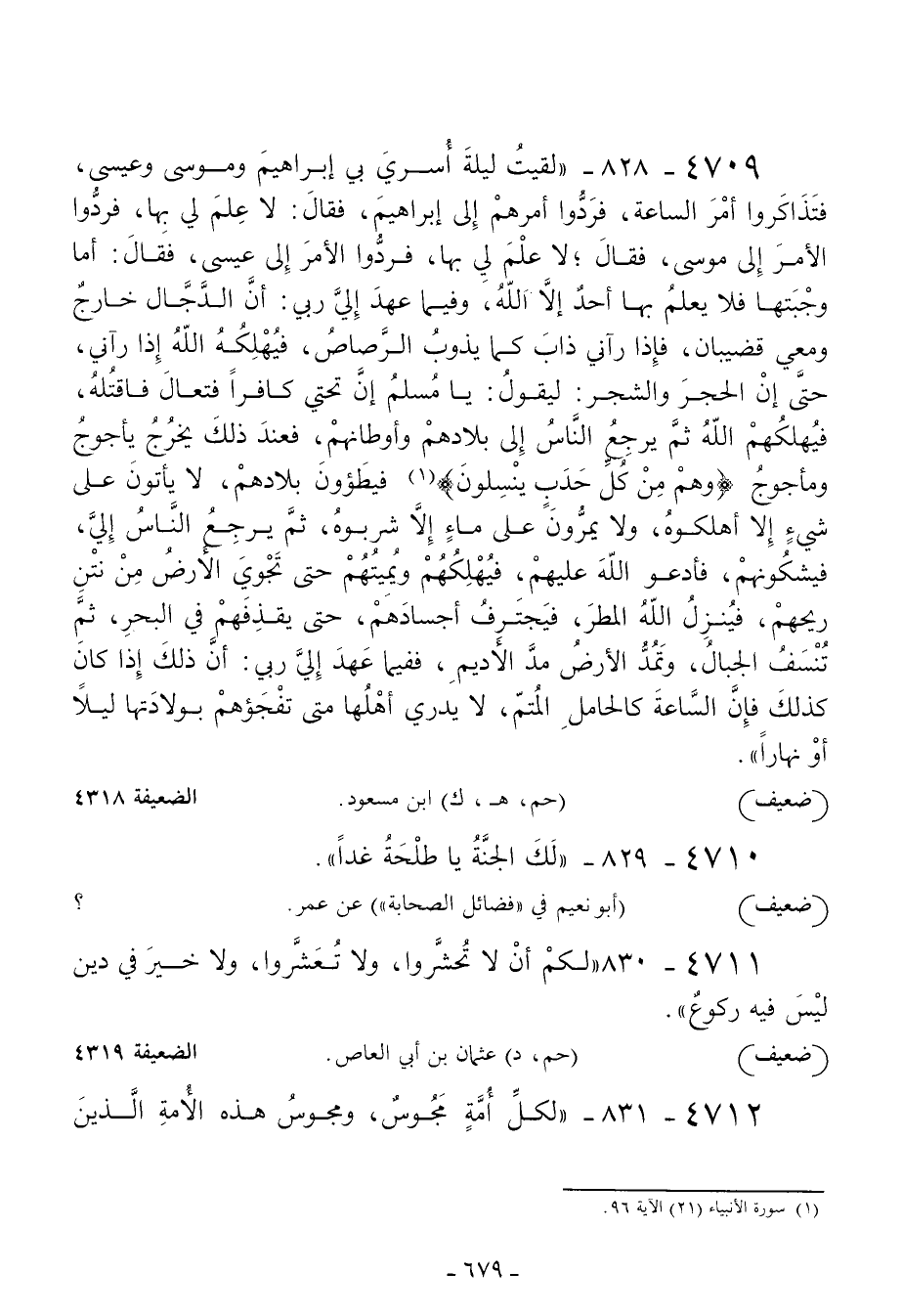4709 - لقيت ليلة أسري بي إبراهيم وموسى وعيسى فتذاكروا أمر الساعة فردوا أمرهم إلى إبراهيم فقال: لا علم لي بها فردوا الأمر إلى موسى فقال: لا علم لي بها فردوا الأمر إلى عيسى فقال أما وجبتها فلا يعلم بها أحد إلا الله وفيما عهد إلي ربي: أن الدجال خارج ومعي قضيبان فإذا رآني ذاب كما يذوب الرصاص فيهلكه الله إذا رآني حتى إن الحجر والشجر: ليقول: يا مسلم إن تحتي كافرا فتعال فاقتله فيهلكهم الله ثم يرجع الناس إلى بلادهم وأوطانهم فعند ذلك يخرج يأجوج ومأجوج {وهم من كل حدب ينسلون} فيطئون بلادهم لا يأتون على شيء إلا أهلكوه ولا يمرون على ماء إلا شربوه ثم يرجع الناس إلى فيشكونهم فأدعو الله عليهم فيهلكهم ويميتهم حتى تجوي الأرض من نتن ريحهم فينزل الله المطر فيجترف أجسادهم حتى يقذفهم في البحر ثم تنسف الجبال وتمد الأرض مد الأديم ففيما عهد إلي ربي: أن ذلك إذا كان كذلك فإن الساعة كالحامل المتم لا يدري أهلها متى تفجؤهم بولادتها ليلا أو نهارا